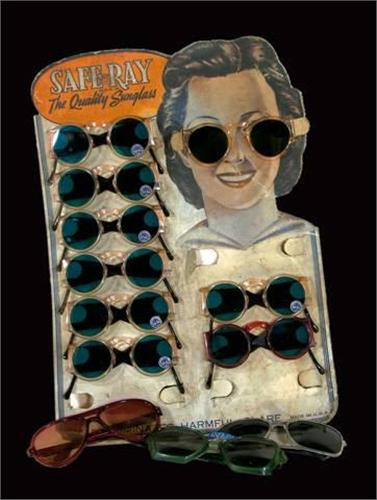 Cardboard store display for Safe-Ray sunglasses with 11 pair of sunglasses. Good Cond.