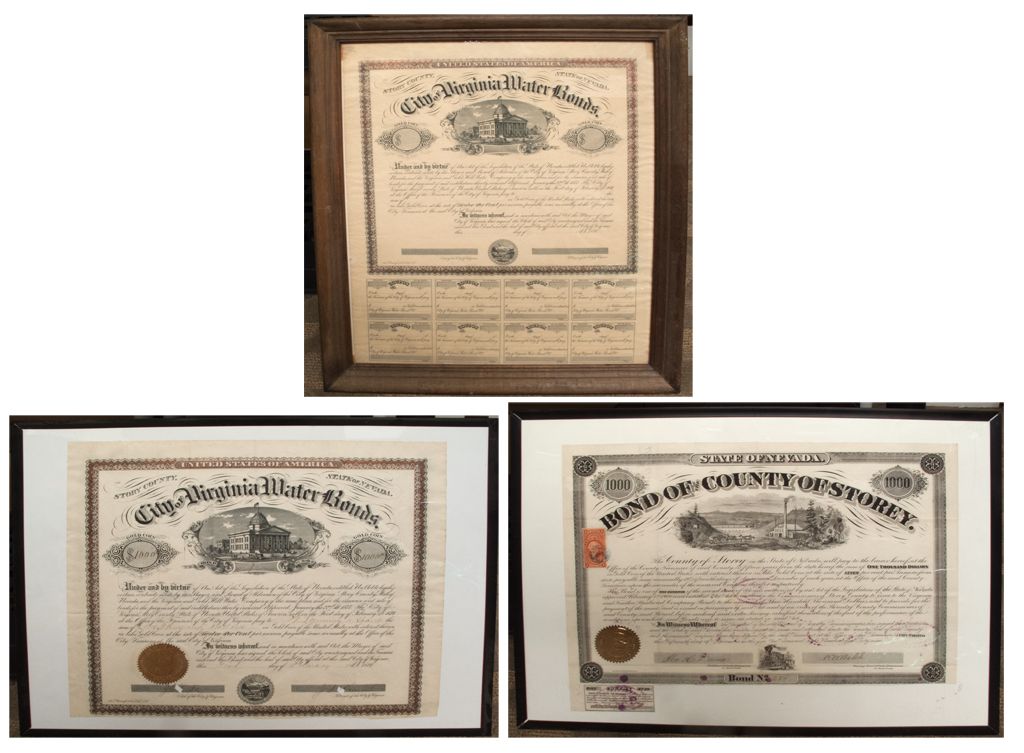 Lot of three Storey County Nevada Bonds; The bonds include the following: 1) Blank Bond sheet originating from the City of Virginia Water Bonds. 2) Bond number 7 from the City of Virginia Water Bonds worth $1000 in “gold coin.”. Gold embossed seal in lower left corner. It is signed by Mayor and Clerk of Virginia City: the signatures have since been punched diagonally. 3) $1000 “Bond of the County of Storey” number 254. There is a red revenue stamp at left, a gold embossing in the lower left corner, standard title vignette and purple cancellation stamp in the center. It is signed by President of the Board of Commissioners of Storey County D.W. Balch and Board Clerk Gen. Dana. GoodCity: Virginia CityCounty: Storey CountyState: NV