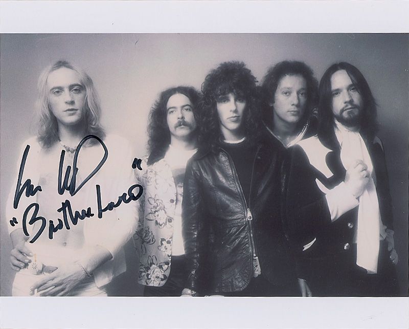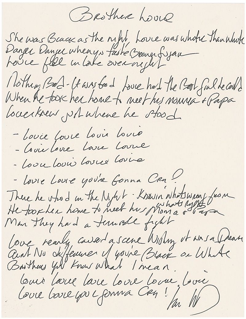 Souvenir handwritten lyrics to ‘Brother Louie,’ written out and signed by Lloyd on an off-white 8.5 x 11 sheet; and a glossy 10 x 8 band photo, signed in black felt tip, “Ian Lloyd ‘Brother Louie.’” In fine condition.