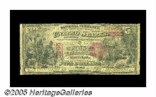 <B>Storm Lake, IA</B></I> - $5 1875 Fr. 405 <B>The First NB</B></I> Ch. # 2595<BR>A well-circulated but intact example from a bank which issued First Charters and Brown Backs only before entering receivership in early 1904. <B>Very Good.</B></I>