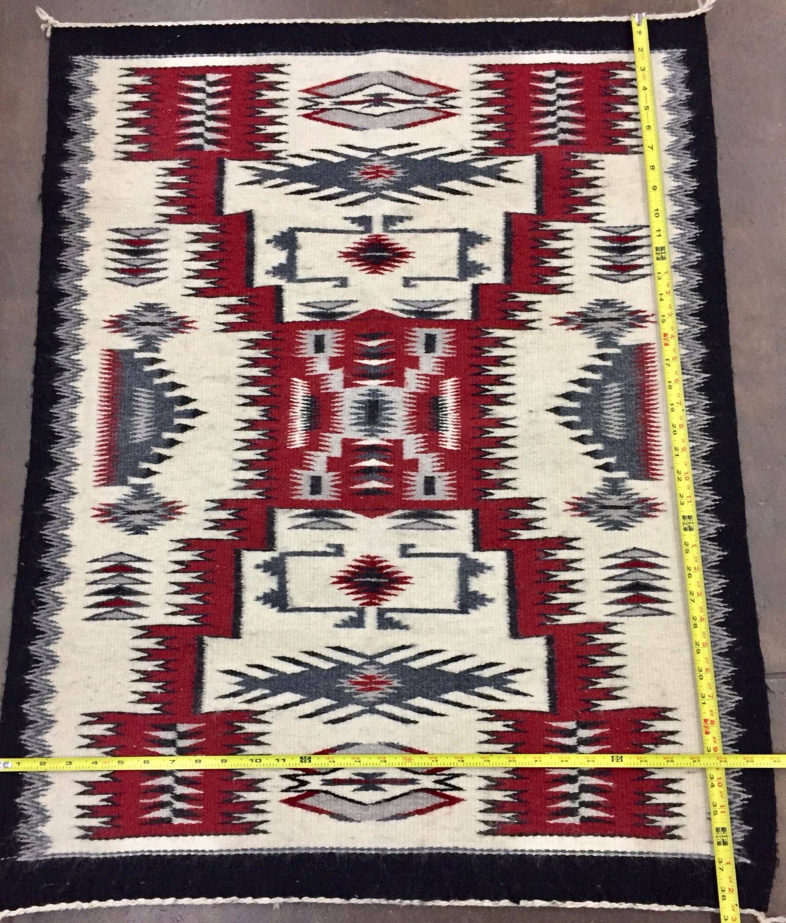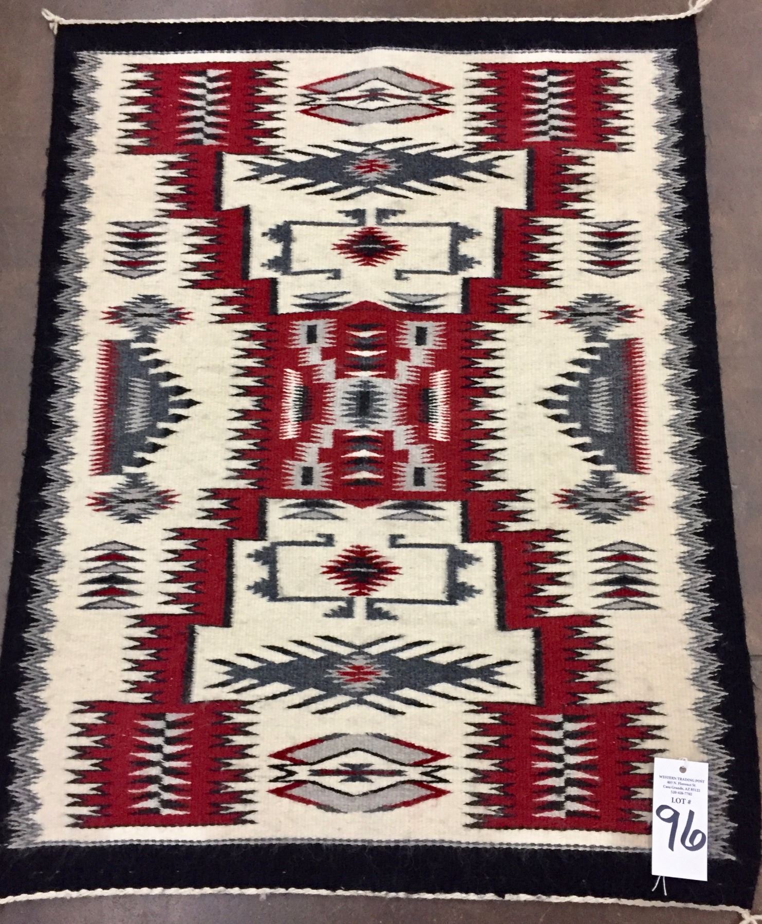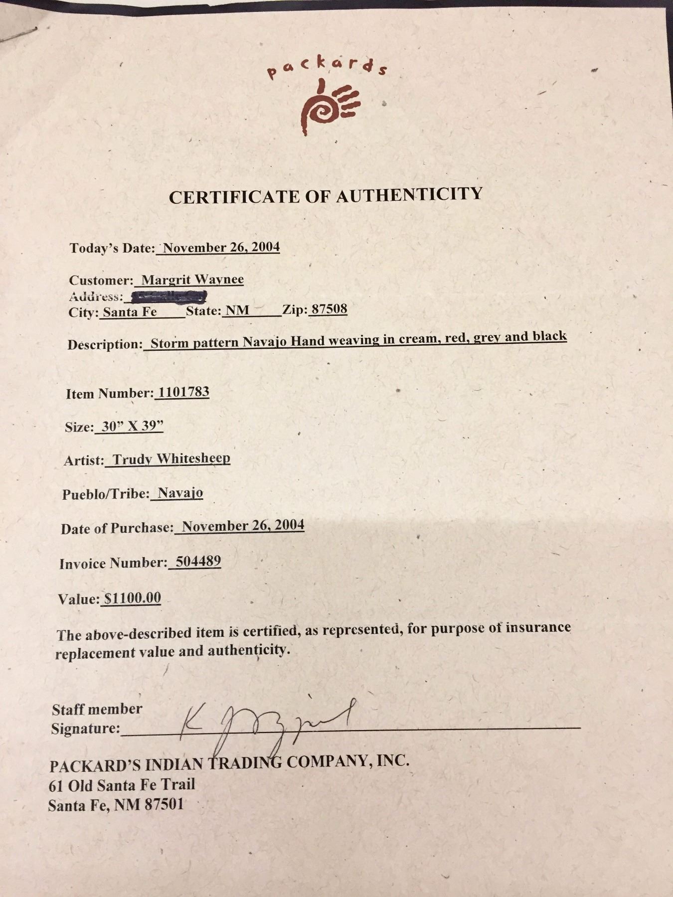 Description: A fine Storm Pattern Navajo textile. Has original paperwork from Packards in Santa Fe. Maker: Trudy Whitesheep, Navajo. Approx. Age: November, 2004 Size: 30” x 39”. Condition: Good for its age, normal wear expected. Please look closely at the pictures - they are an important part of our description. Shipping: There will be a $7 handling / packaging fee for shipping this lot. The actual cost of postage will be added on top of that.