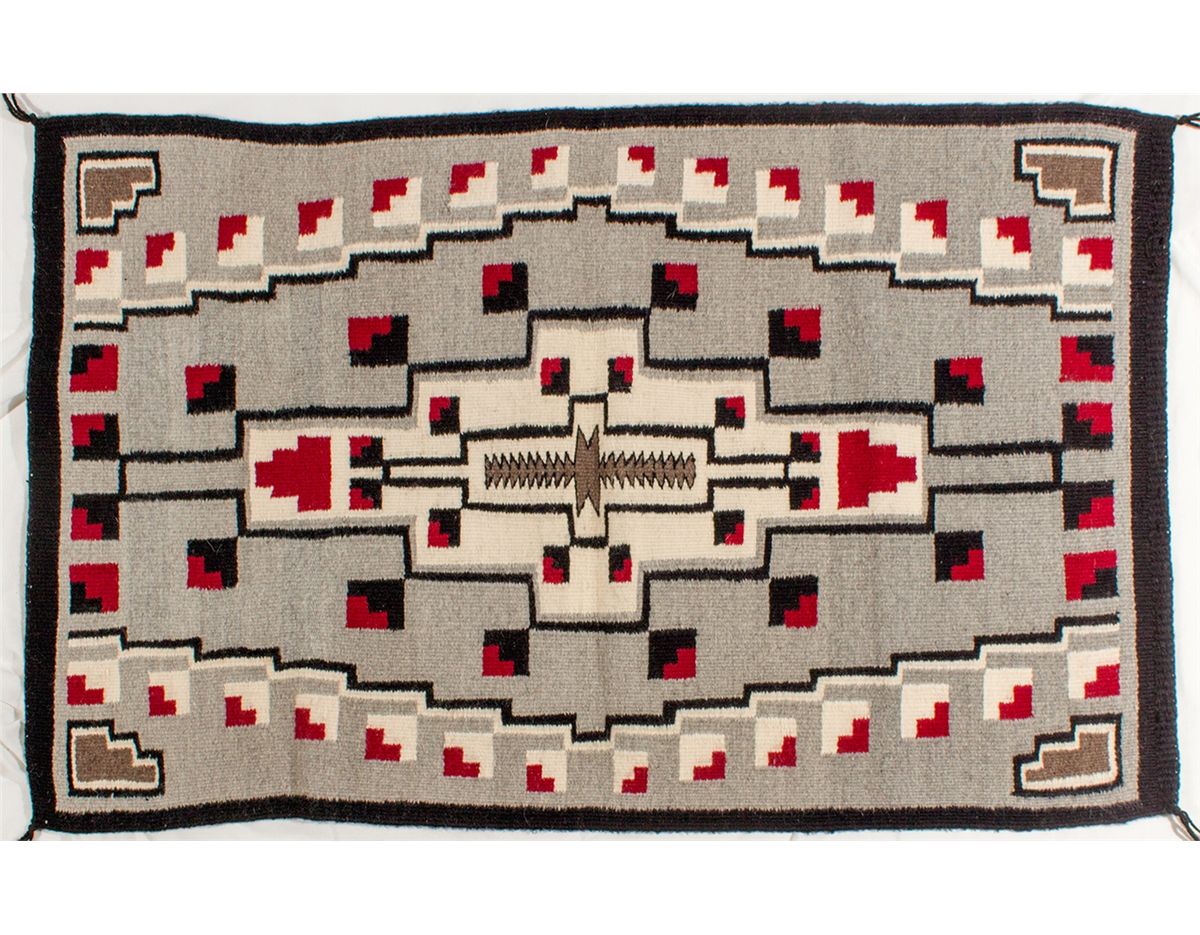 A small storm pattern wool rug in traditional colors of red, black, natural and brown designs on a gray ground. Black border. Storm pattern rugs consist of a bordered design with the middle of the weaving representing the center of the universe. Four corner rectangles represent the 4 winds or, in some interpretations, the 4 sacred mountains of the Navajo. Lightning bolts connect these corner rectangles. The pattern originated in the western region of the reservation around Tuba City, AZ [www.rugtrader.com/styles/storm5.htm]. It measures 28 x 45.” Weaver: Rita Ben, of Chinle, AZ. In excellent condition. Fairbanks Collection - HKA#65391