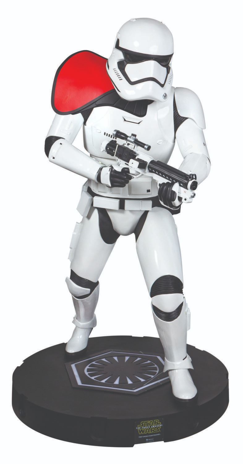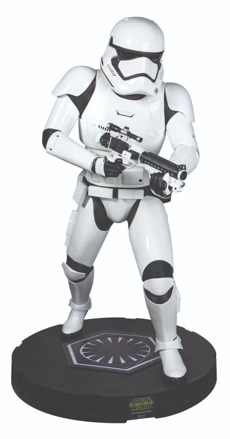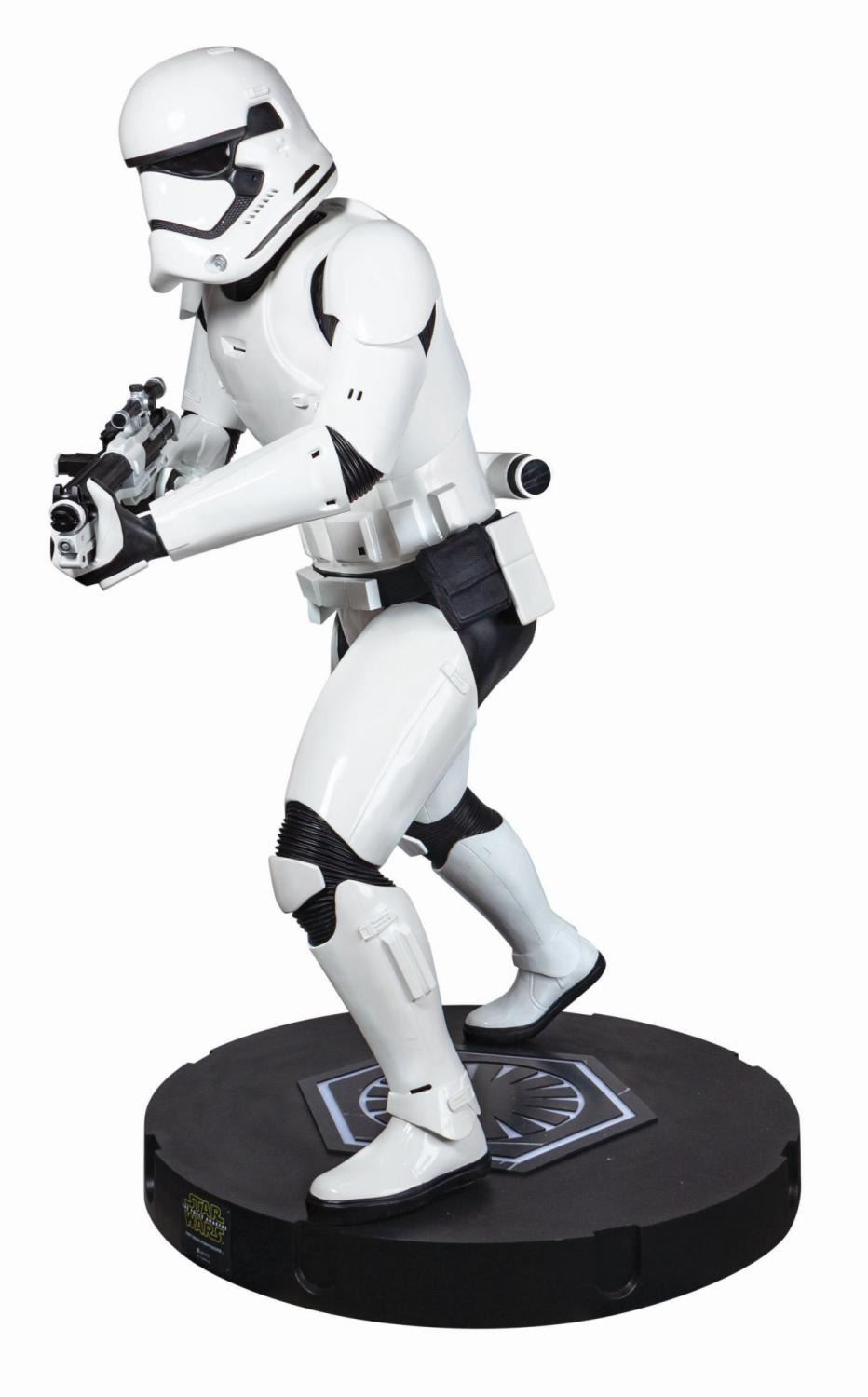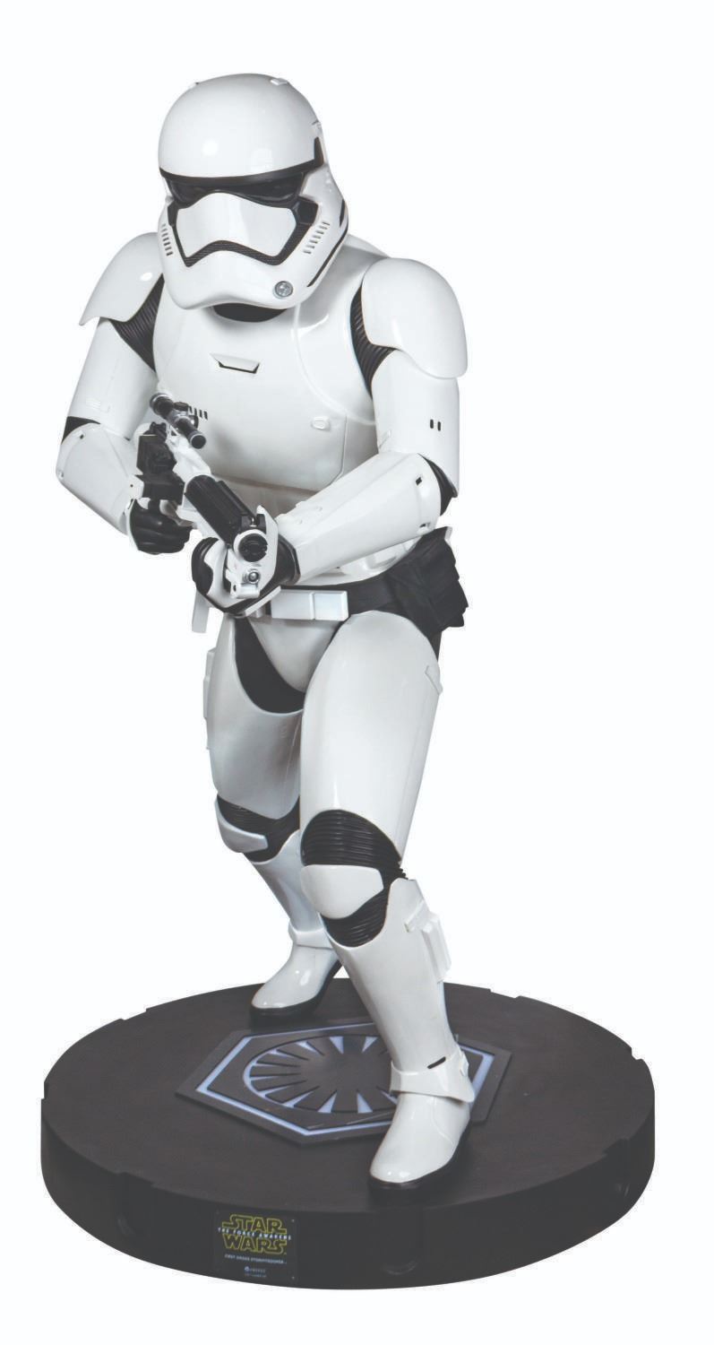 (Disney, 2016) A life-size Stormtrooper display created in celebration of Star Wars: The Force Awakens. Working in partnership with Lucasfilm, the Stormtrooper armor was created from precision 3D scans of an actual screen-used armor set provided from production. The figure is constructed of fiberglass and resin, fully painted and finished with manufactured undercuts for an added sense of depth and dimensionality. Fixed in a menacing battle pose, the First Order trooper wields a replica F-11D blaster rifle with push-button illuminating action and includes a removable red leather officer's shoulder pauldron. The statue is mounted to a custom base with a working central light-up First Order insignia. The Stormtrooper measures approximately 63.5" tall, 28" wide, and 37" deep, and the display base is 41.5" in diameter. The photo shown here is presented for reference only; the display being offered is new in its original crate. Some assembly will be required. This item may require special shipping arrangements, please inquire for details and estimates.