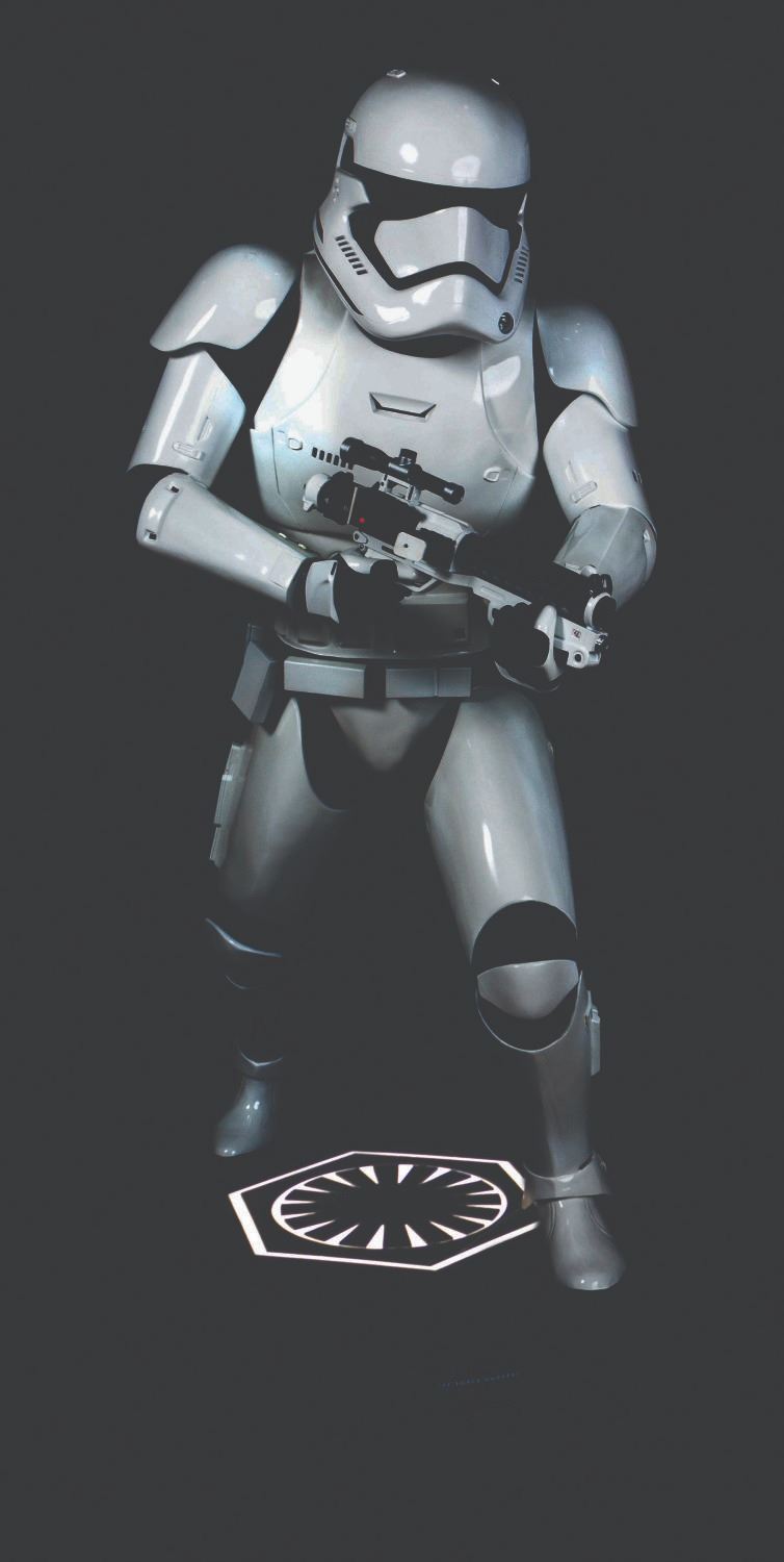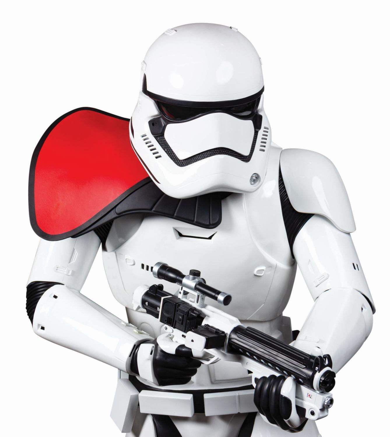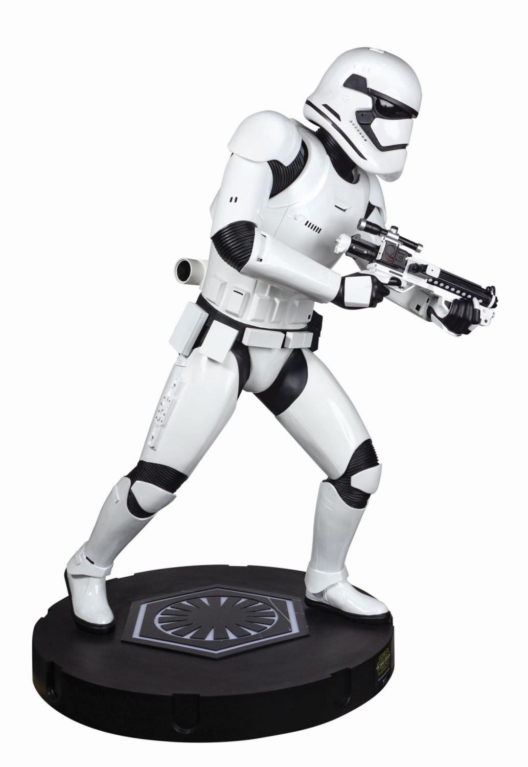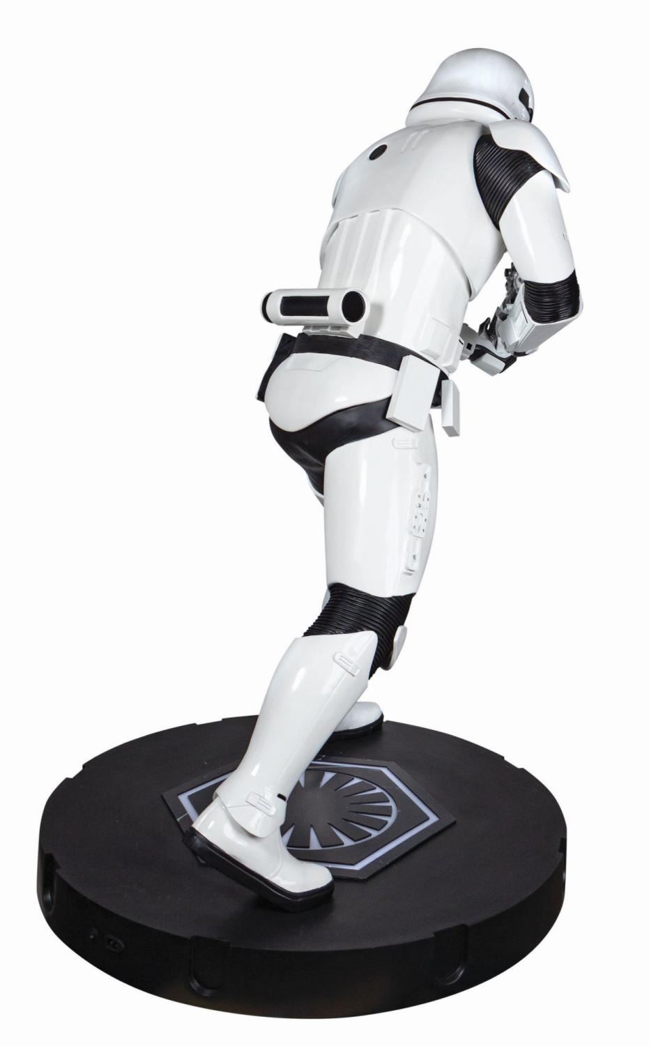 (Disney, 2016) A life-size Stormtrooper display created in celebration of Star Wars: The Force Awakens. Working in partnership with Lucasfilm, the Stormtrooper armor was created from precision 3D scans of an actual screen-used armor set provided from production. The figure is constructed of fiberglass and resin, fully painted and finished with manufactured undercuts for an added sense of depth and dimensionality. Fixed in a menacing battle pose, the First Order trooper wields a replica F-11D blaster rifle with push-button illuminating action and includes a removable red leather officer's shoulder pauldron. The statue is mounted to a custom base with a working central light-up First Order insignia. The Stormtrooper measures approximately 63.5" tall, 28" wide, and 37" deep, and the display base is 41.5" in diameter. The photo shown here is presented for reference only; the display being offered is new in its original crate. Some assembly will be required. This item may require special shipping arrangements, please inquire for details and estimates.