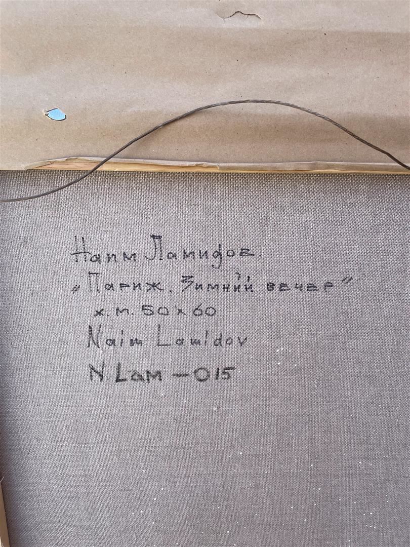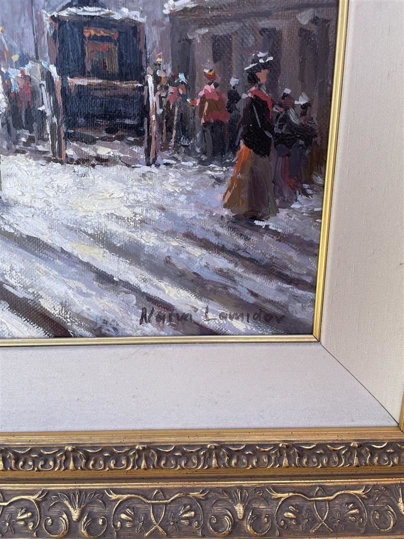 Uzbekistani artist, Naim Lamidov, depicts the bustling, turn-of-the-century winter scene as people hurry to their destination before the onset of a storm in this oil on board. The painting measures 20 x 24; framed image measures approx. 32 x 36.