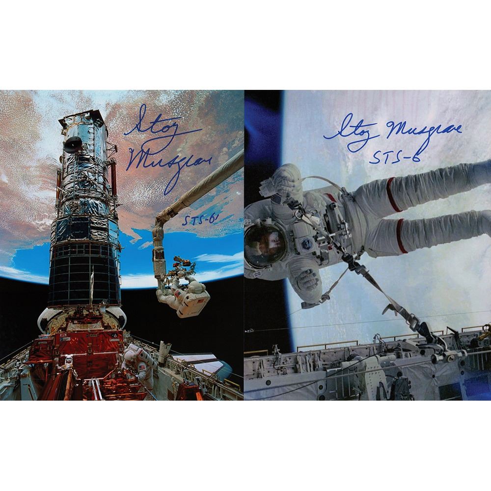 Attractive pair of color glossy photos, 8 x 10 and 10 x 8, depicting mission specialist Story Musgrave performing a spacewalk during the STS-6 mission, both signed in blue felt tip, "Story Musgrave, STS-6." In overall very fine condition. During this maiden voyage of Space Shuttle Challenger, the crew performed the first Shuttle deployment of an IUS/TDRS satellite, and Musgrave and Don Peterson conducted the first Space Shuttle extra-vehicular activity (EVA) to test the new space suits and construction and repair devices and procedures.