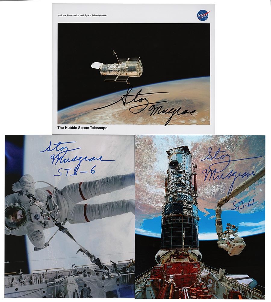 Three photos signed by Story Musgrave: an official color 10 x 8 NASA lithograph of the Hubble Space Telescope, signed in black felt tip (reverse bears information text); a color satin-finish 10 x 8 photo of Musgrave performing a Space Shuttle EVA, signed in blue felt tip, with Musgrave adding "STS-6"; and a color glossy 8 x 10 photo of Hubble’s first servicing EVA, signed in blue felt tip, with Musgrave adding "STS-61." The latter photo depicts Musgrave, anchored on the end of the Remote Manipulator System (RMS) arm, preparing to be elevated to the top of the Hubble Space Telescope to install protective covers on the magnetometers. In overall very fine condition.