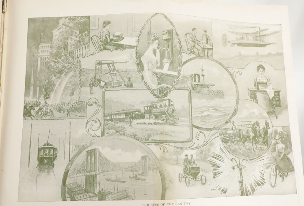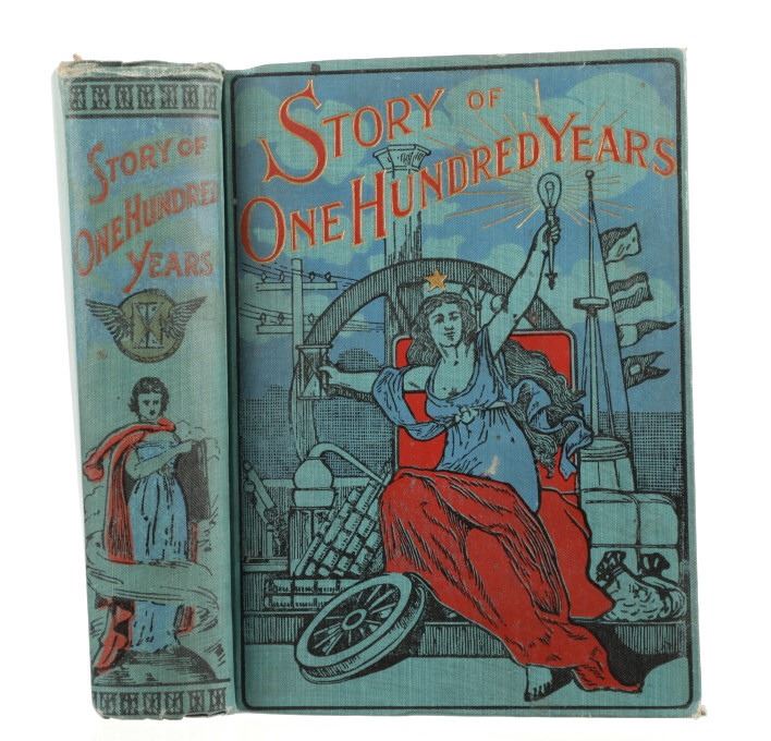 Included in this lot is the Rare First Edition of, "Story Of One Hundred Years" by Daniel B. Shepp, published by Globe Bible Publishing Company, Philadelphia, 1900. With over 100+ vivid illustrations"Story of One Hundred Years: A Matchless Record of the Greatest Century of Historic Time; A Comprehensive Review of the Political and Military Events, the Social, Intellectual and Material Progress, and the General State of Mankind in All Lands. Embodying detailed and accurate accounts of all things of importance and interest, from 1801 to 1900, Inclusive". Written "for the masses", this book highlights the major world events during the 19th century. While the book covers US and foreign political ideas and events, it especially emphasizes scientific and technological advancements of the century. Viewed through the lens of history past, the 19th century indeed was the century of more advances than any period in combined history. This blue cloth bound gold gilt hardcover book is in good overall condition, stamped vignette on front cover and spine, scuffing noted to cover edges, loose spine. Intact pages exhibit age tanning and very minimal foxing noted. No other obvious marring seen, measures 7.5"W x 9.75"L x 1.75"D