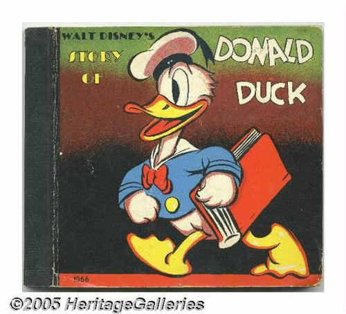 <B>Story of Donald Duck (Whitman, 1938) Condition: FN.</B></I> Possibly the most popular volume in the entire small Whitman series, the calm picture of Donald on the cover fails to reflect the typical Duck mayhew found inside! Very reflective on Donald's personality and his popularity in the 1930s. Some aging to interior pages, cover crease, overall light wear. Not listed in Overstreet. <I>From the Larry Jacobs Collection.</B></I>