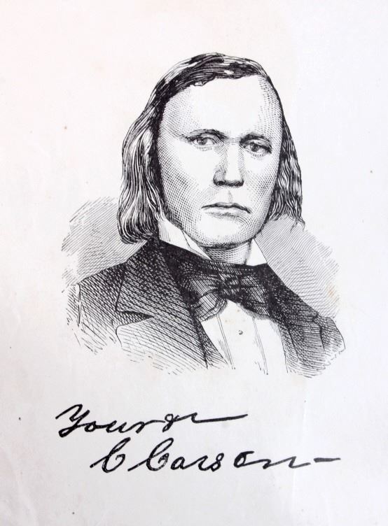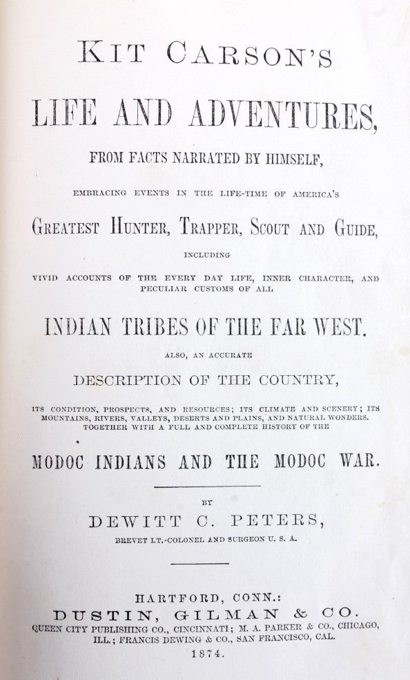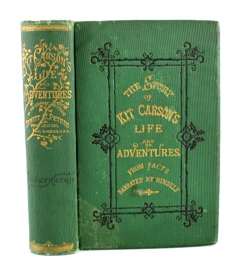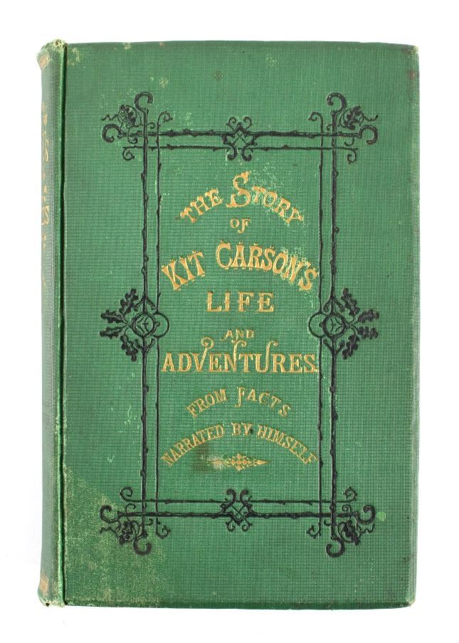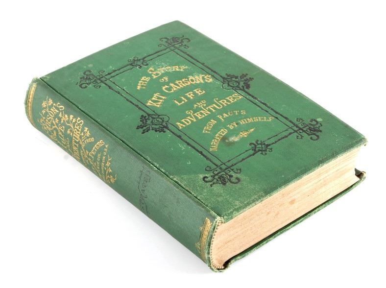 This is a scarce edition of "The Story of Kit Carson's Life and Adventures" by Dewitt C. Peters published in 1874. Kit Carson was an American frontiersman who lived as a mountain man, Indian agent and Army officer throughout his life. This book chronicles many of his greatest adventures. The book shows good condition with a beautiful gilt decorated cover and spine. It measures 6" x 9".