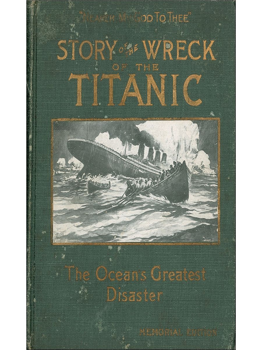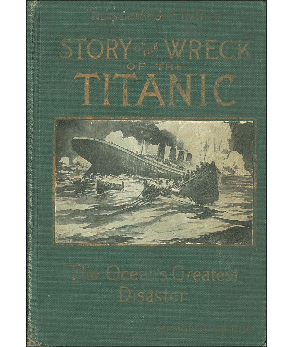 Two green, gold-lettered hardcover copies of the Story of the Wreck of the Titanic: The Ocean’s Greatest Disaster, Memorial Editions, by Marshall Everett. P. A. Lindberg, Chicago. Both books feature the imprint, “Nearer My God to Thee,” across the top edge. Covers feature an artist’s rendition of the Titanic sinking, stern up, with lifeboats fleeing the scene.