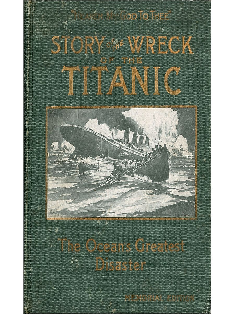 Two green, gold-lettered hardcover copies of the Story of the Wreck of the Titanic: The Ocean’s Greatest Disaster, Memorial Editions, by Marshall Everett. P. A. Lindberg, Chicago. Both books feature the imprint, “Nearer My God to Thee,” across the top edge. Covers feature an artist’s rendition of the Titanic sinking, stern up, with lifeboats fleeing the scene.