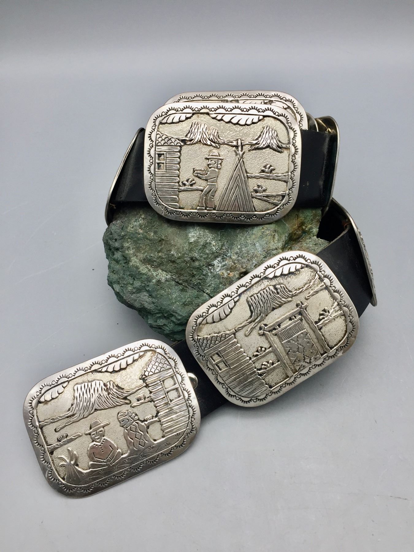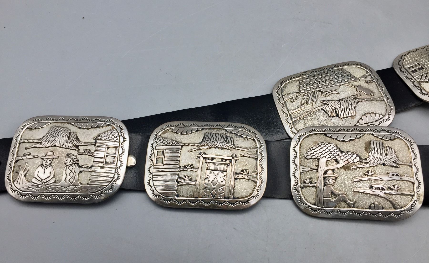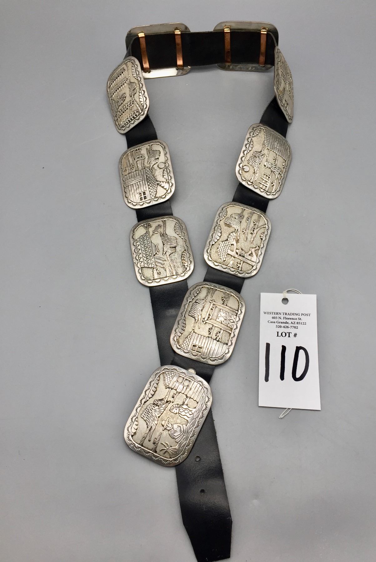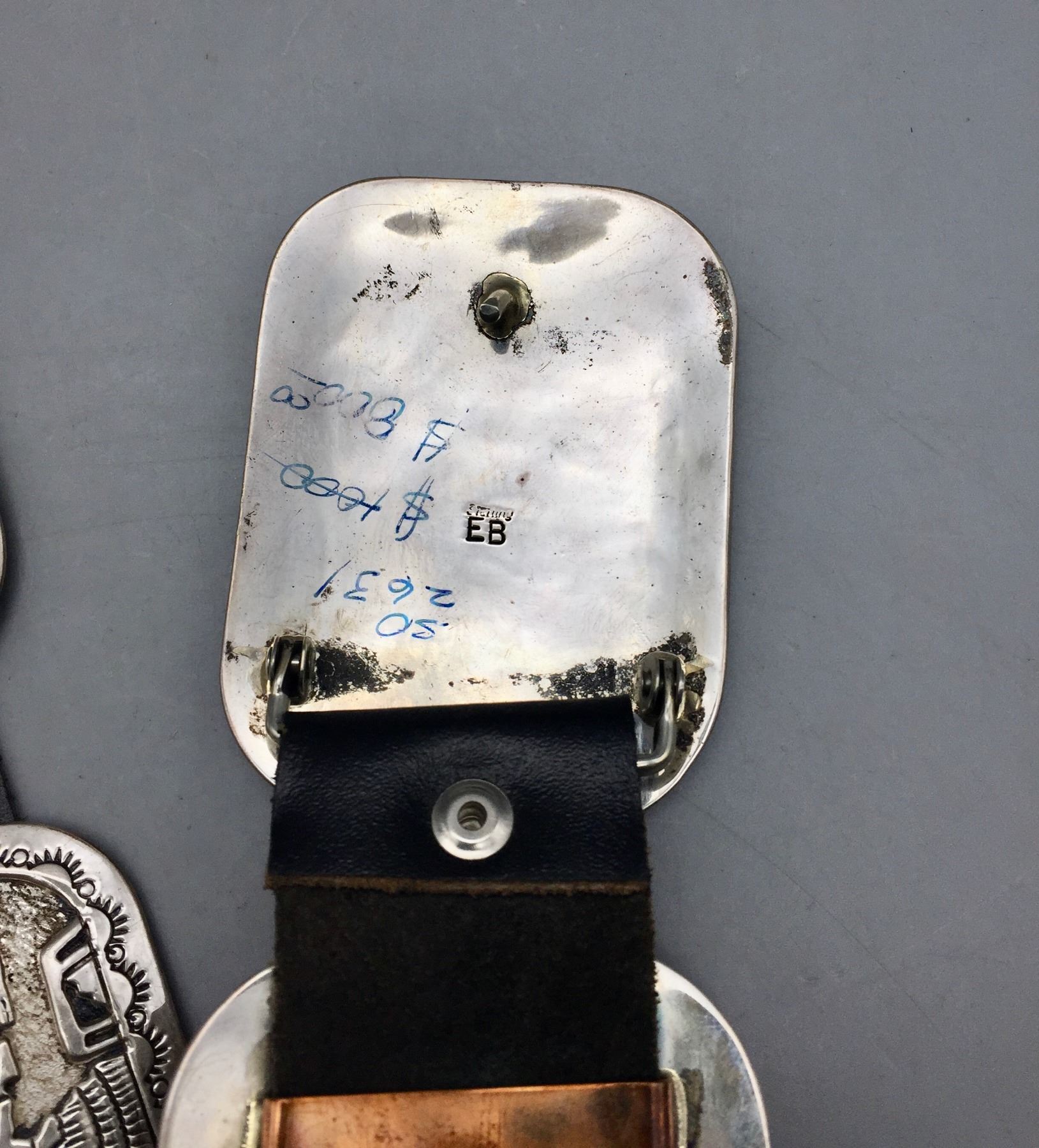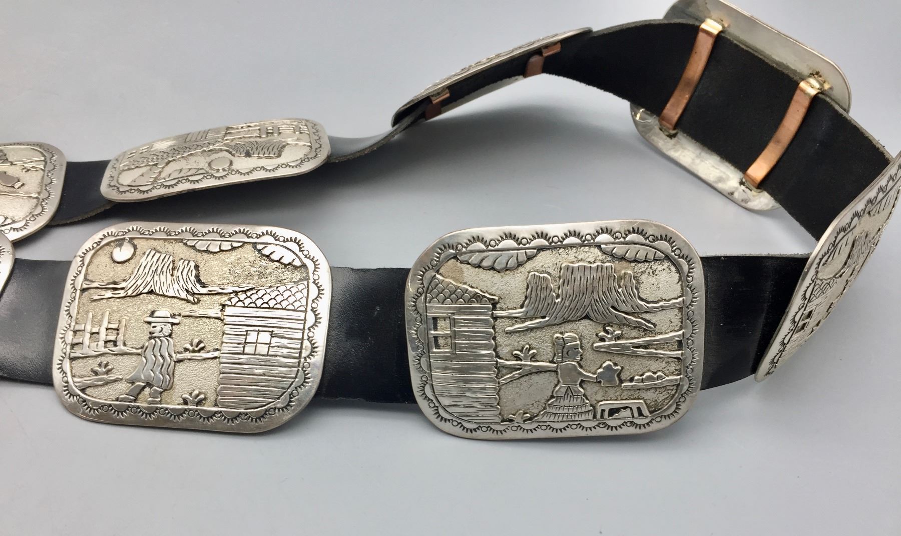 Description: Presented for sale in this lot is a very nice, storyteller concho belt on black leather. Each concho tells a different part of the story. Maker: Hallmarked EB. Approx. Age: Vintage. Size: Measures approx. 45-1/2” long, including buckle. Conchos and buckle measures 3”w x 2-1/2” tall. Weighs 614 grams. Condition: Good for its age, normal wear expected. Please look closely at the pictures - they are an important part of our description. Shipping: There will be a $5 handling / packaging fee for shipping this lot. The actual cost of postage will be added on top of that.