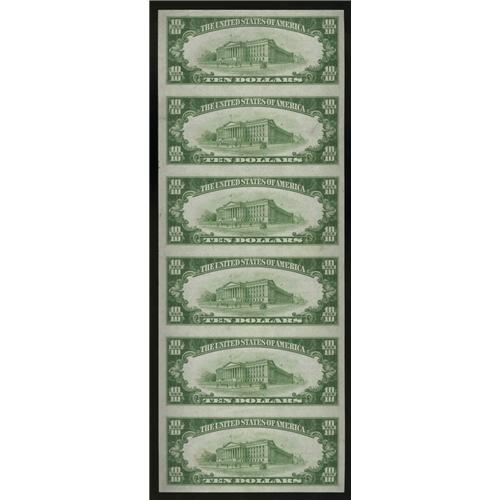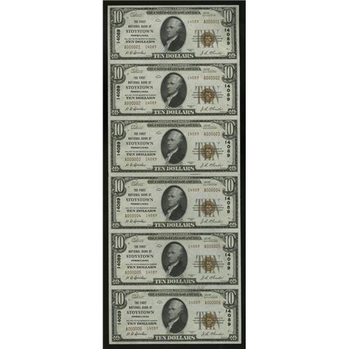 <B>Stoystown, PA</B></I> - $10 1929 Ty. 2 <B>The First NB</B></I> Ch. # 14089 Uncut Sheet<BR>This number 1-6 uncut sheet was rumored to have been cut in the recent past, but it is still as beautiful as it was when we originally sold it in January 2001. This 14000 charter bank does not have an individual note recorded in the census. All that is available on this bank are two uncut sheets. <B>Gem Crisp Uncirculated.</B></I><BR><BR><b>Shipping:</b> Coin/Currency (<a target="_blank" href="http://www.heritageauctions.com/common/shipping.php">view shipping information</a>)