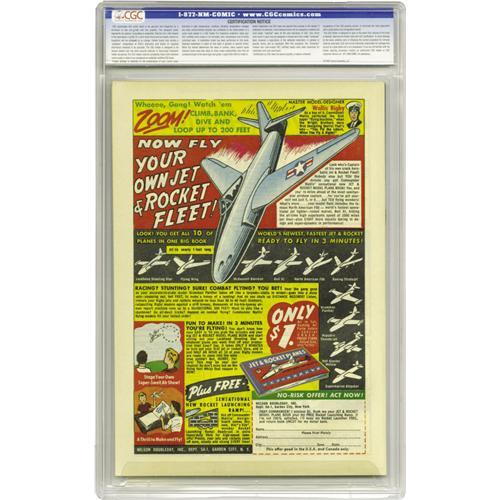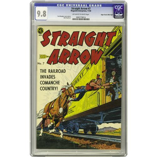 <B>Straight Arrow #7 Mile High pedigree (Magazine Enterprises, 1950) CGC NM/MT 9.8 Off-white to white pages.</B></I> As many times as we've seen and marveled at stunning Mile High books, Gaines File copies, and copies from other prestige pedigrees, a book like this still grabs our attention. The grade, of course, certifies that this is a pristine copy, and try as we may to find the tiniest of faults, we can't! The abundance of white on both covers makes the final grade assignment even more impressive. Fred Meagher cover, with Meagher and Bob Powell art. Overstreet 2006 NM- 9.2 value = $220. CGC census 3/06: 1 in 9.8, none higher.
