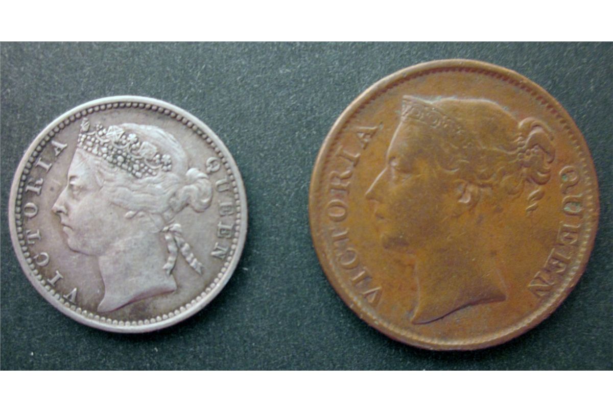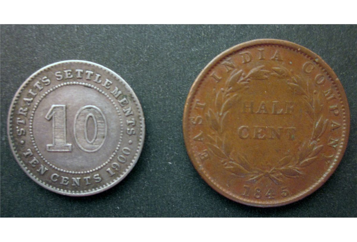 Straits Settlement; 1845 ½ Cents and 1900 10 Cents. Two coins VF-EF.