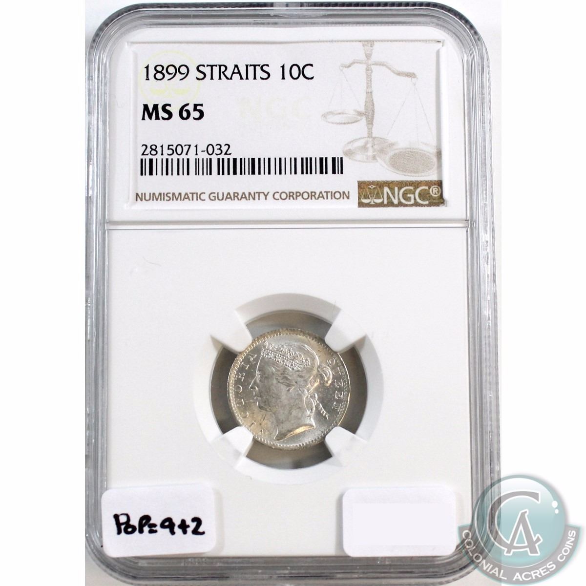 Straits Settlements; 1899 10-cent NGC Certified MS-65. Tied for 2nd finest, with population of 9, and only two graded higher!