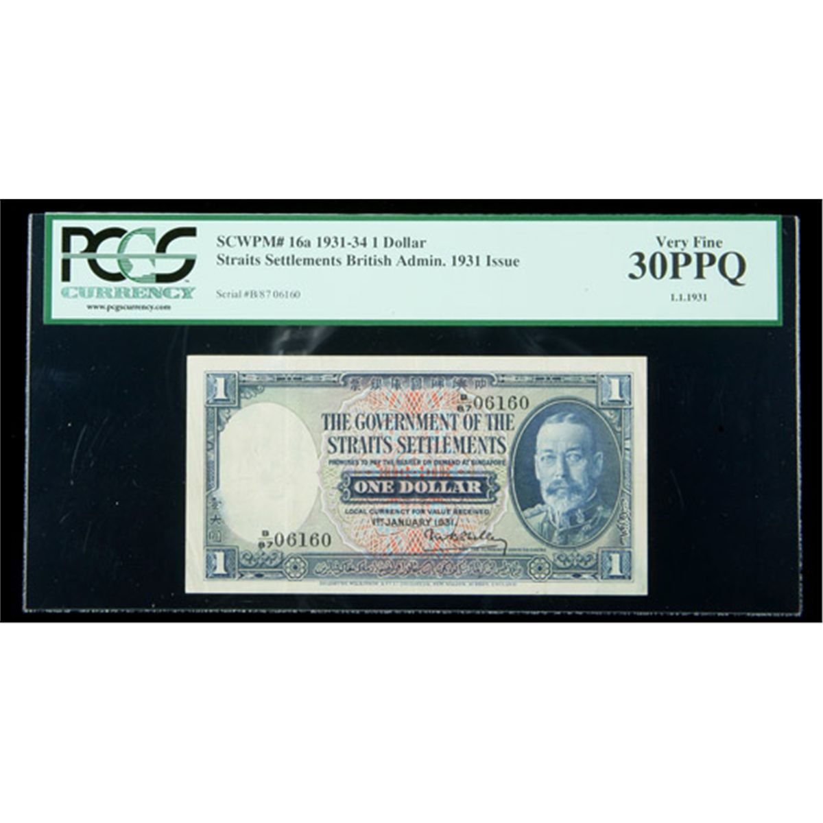 Straits Settlements SCWPM# 16a, 1.1.1931 1 Dollar. PCGS Very Fine 30PPQ. . Fr-P-16a. Pleasing and original, a lovely example of this issue from a British crown colony in Southeast Asia that included the territories of Malacca, Dinding, Penang, and Singapore. Scarce any finer, with the Krause reference not listing any valuation above $550 in "XF" grade.