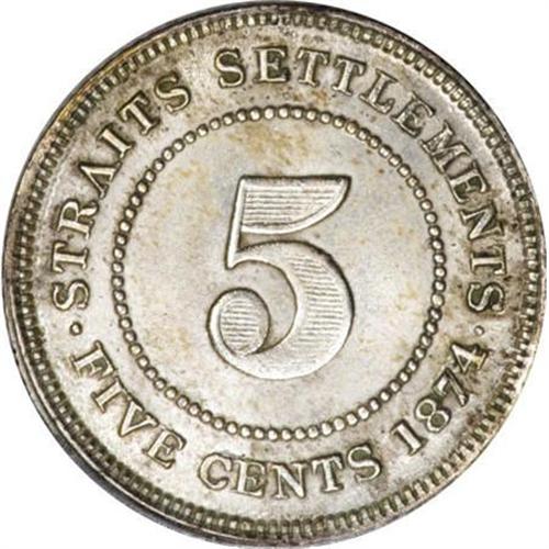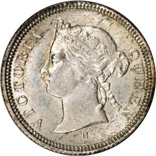 <B>Victoria silver 5 Cents 1874-H,</B></I> KM-10, small mintage of 60,000 pieces for this early date in the series, Uncirculated and choice overall, the surfaces showing no marks and speckled light silvery gold toning, reverse sharper than obverse, where the queen's tiara is a bit soft in detail. Rare grade.<BR><BR><b>Shipping:</b> Coins & Currency (<a target="_blank" href="http://www.heritageauctions.com/common/shipping.php">view shipping information</a>)