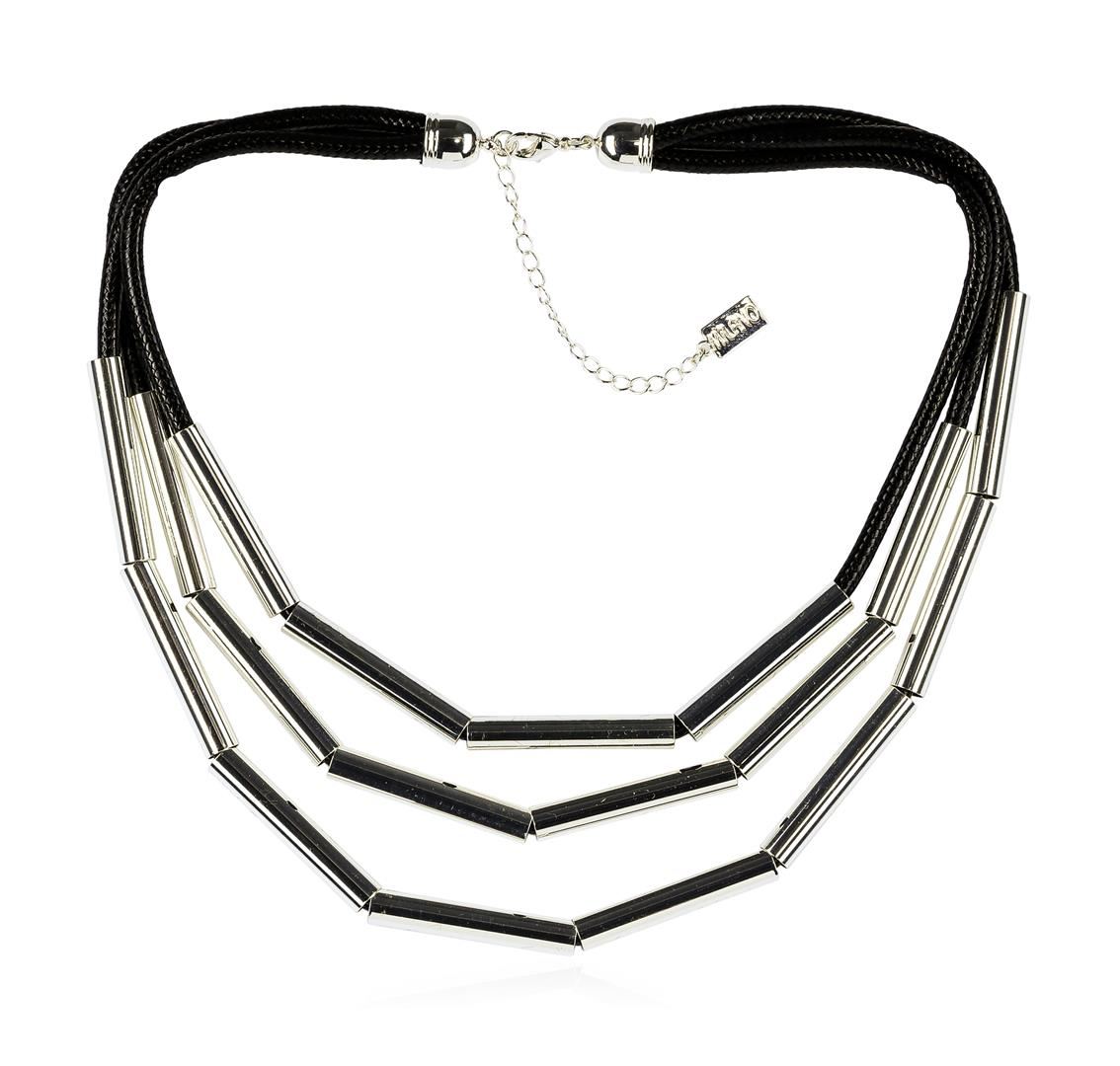 High end designer jewelry. Strand Cord Necklace - Rhodium Plated. Rhodium Plated(3.5") Ext Clasp. Black/ Silver. 19inches.