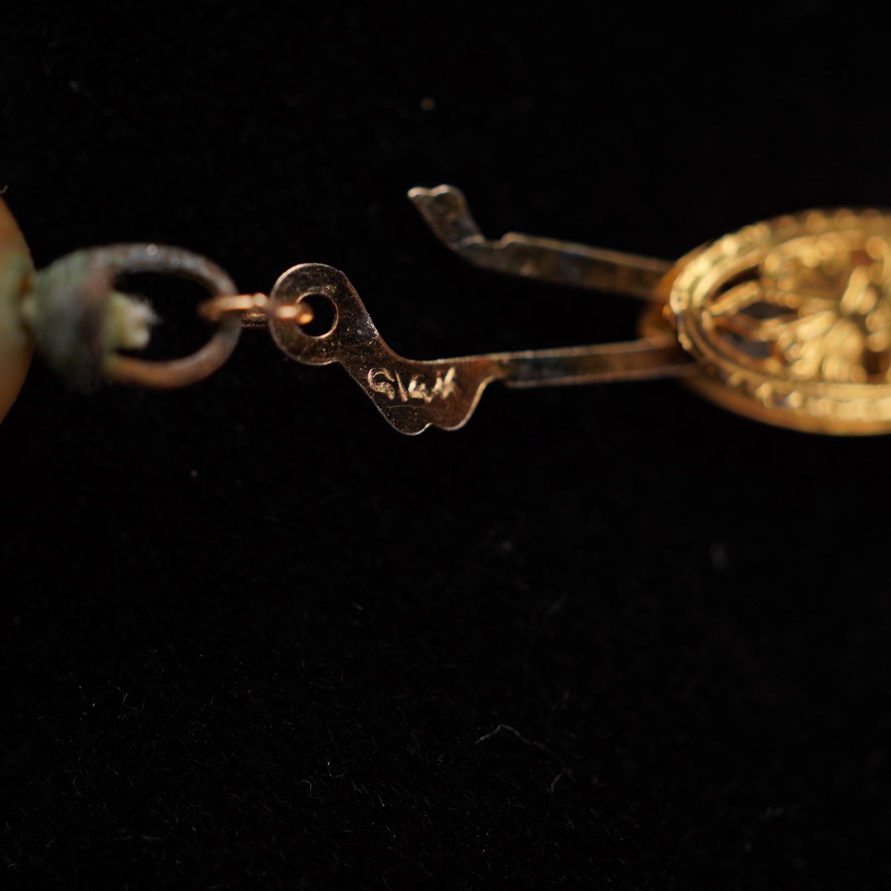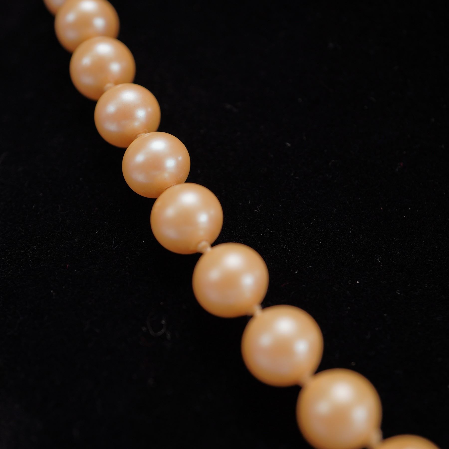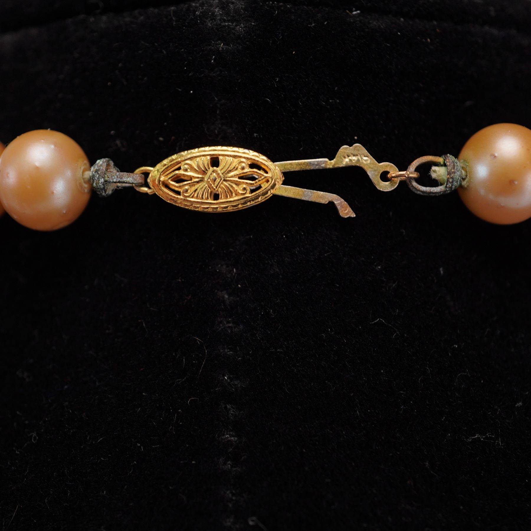 A timeless single strand necklace of uniform round imitation pearls in a warm golden tone, hand-knotted between each bead and finished with an ornate filigree clasp stamped 14K. A graceful piece blending vintage style with everyday wearability.