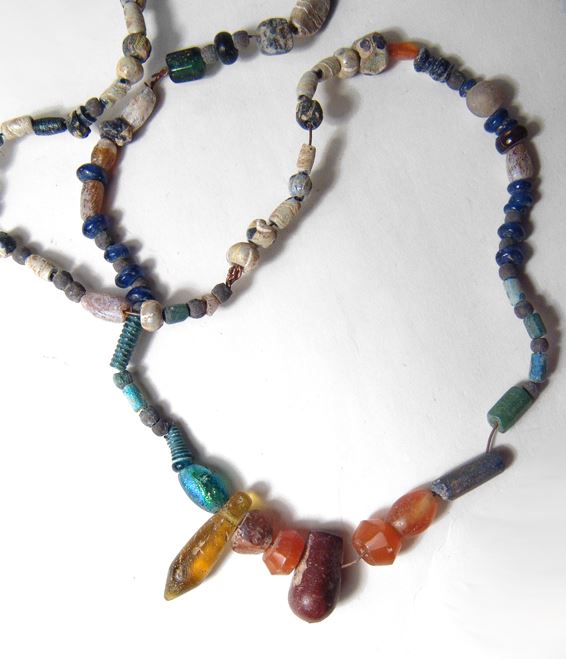 A nice strand of glass and stone beads from the Holy Land. Strand includes a myriad of Roman glass beads, c. 1st - 5th Century AD, of varying sizes, shapes and colors, many with brilliant iridescence and with a deep yellow glass tapered pendant. Also included are a few stone beads, c. 1st Millennium BC, in carnelian and of different shapes, a couple with wedged sides. Length of strand about 24 in (60.8 cm). Ex Los Angeles private collection.