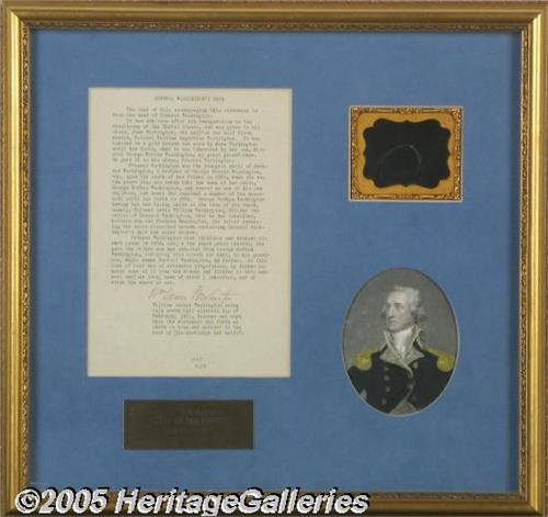 <B>Strands from the Father of our Country... A Lock of George Washington's Hair</B></I> A set of several strands of George Washington's hair, nicely framed in a 3.5" x 2.75" brass mat under glass, together with a color portrait of Washington in his general's uniform and a typed and signed letter of provenance from William Lanier Washington dated February 11, 1921. The letter notes that the lock was first cut "...soon after his inauguration to the Presidency of the United States, and was given to his niece, Jane Washington, who married her half first cousin, Colonel William Augustine Washington. It was incased in a gold brooch and worn by Jane Washington until her death, when it was inherited by her son, Colonel George Corbin Washington, my great grandfather. He gave it to his niece, Frances Washington. Frances Washington was the youngest child of Bushrod Washington, a brother of George Corbin Washington, who, upon the death of her father in 1830, when she was two years old, was taken into the home of her uncle, George Corbin Washington, and reared as one of his own children, and where she remained a member of his household until his death in 1854. George Corbin Washington having but one living child at the time of his death, namely, Colonel Lewis William Washington, divided the relics of General Washington, that he had inherited, between him and Frances Washington, the latter received the above described brooch containing General Washington's hair and other relics. Frances Washington died childless and without direct issue in 1900, and, a few years prior thereto, she gave the relics she had received from George Corbin Washington, including this brooch and hair, to his grandson, major James Barrell Washington, my father. As this lock of hair was of extensive proportions, my father removed some of it from the brooch and divided it into several smaller lots, some of which I inherited, and of which the above is one." A wonderful presentation with excellent provenance. An evocative keepsake from the great man who helped found the Republic.