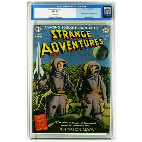 <B>Strange Adventures #1 (DC, 1950) CGC VF+ 8.5 Off-white pages.</B></I> The 1950s sci-fi craze began in earnest with the major motion picture "Destination Moon." This big-budget production was the era's equivalent to such later films as "2001 A Space Odyssey," depicting space travel in a realistic manner never before seen in the old Flash Gordon serials and their like. This comic, DC's initial foray into the genre, naturally featured an adaptation of "Destination Moon," along with a photo cover. In addition, there's a feature on H. G. Wells, with art by <B>Batman</B></I> artist Dick Sprang, plus the first Chris KL-99 story with art by Howard Sherman. Overstreet 2005 VF 8.0 value = $2,040; VF/NM 9.0 value = $3,420. CGC census 11/05: 5 in 8.5, 4 higher.