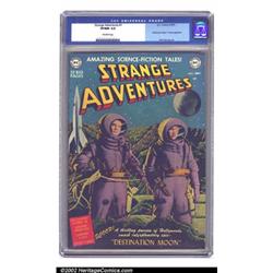 Strange Adventures #1 (DC, 1950) CGC VF/NM 9.0 Off-white pages. DC's dominance during the 1950s, when so many comic publishers gave up, phased out, or were shut down, was due in part to their "cash cows," Superman and Batman, but also due to their ability to retool and reshape the industry with titles such as this, their first science-fiction title. This famous photo cover is rarely seen in this nice condition. This is the highest grade CGC has awarded a copy of this issue to date. Overstreet 2002 NM 9.4 value = $4,000. Important notice: We expect to be auctioning lots at the rate of 200-250 per hour. Sometimes eBay Premier live bid software cannot keep up with that pace, so we strongly recommend that you place a realistic proxy bid now as insurance to avoid disappointment. Also please note that all Heritage/CAA lots purchased through eBay Premier carry a 20% Buyer's Premium. Please make sure you read the Terms and Conditions.