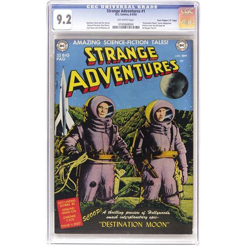 <B>Strange Adventures #1 Davis Crippen ("D" Copy) pedigree (DC, 1950) CGC NM- 9.2 Off-white pages.</B></I> Like most of the Davis Crippen books, this one was apparently never read, accounting for this copy's condition, which has put it alone at the top of CGC's census as of this writing. This key first issue of the long-running series contains an adaptation of "Destination Moon," with a preview of the movie. The distinctive grey tone/photo cover is one of the more memorable science-fiction covers in all of comics. Overstreet 2006 NM- 9.2 value = $5,000. CGC census 6/06: 1 in 9.2, none higher. <I>From the Crippen Collection.</B></I> <BR><BR><B>Important notice:</B> Heritage usually auctions material at the rate of 200-250 lots per hour. On some occasions eBay Live bid software or the Internet may not be able to keep up with the pace of the auction. We recommend placing a realistic absentee bid now as insurance to avoid disappointment. Occasionally the auctioneer may eliminate or reject an eBay Live bid, and the auctioneer may also reopen a lot after the close of the eBay live bidding (usually because we missed an audience bid), and may reject your bid even if it shows you as the winning bidder. By bidding via eBay Live, you agree that Heritage may award the lot to another bidder at its sole discretion under the circumstances described above or any other reasonable circumstances. Since eBay bids are not shown to us until we open the lot on the floor, we treat those bids just like floor bids. In most cases the floor responds before the eBay bid is presented to us, due to Internet lag time, so for consistency we have made it a policy that floor bids are always considered first over tie eBay live bids. Also please note that all Heritage lots purchased through eBay Live carry a 22.5% Buyer's Premium. Please make sure you read the Terms and Conditions before you bid. This lot is being auctioned in conjunction with a live floor auction by Heritage Auction Galleries. All final auction and invoice information will be supplied by Heritage Auction Galleries, and all other information should be considered preliminary. Lot:41001 <BR><BR><B>Winning Notification and Billing:</B> After the FINAL session in this auction is complete, Heritage will send e-mail and snail mail invoices. This process normally takes several days. All final auction and invoice information will be supplied by Heritage Auction Galleries, and all other information should be considered preliminary. <BR><BR>This auction will be conducted on a live auction floor and over the Internet through eBay Live. If you choose to place an absentee bid, please take a moment to <font color='#0000ff'><u><a href='http://pages.ebay.com/liveauctions/help/before/laabsentee.html'>learn how eBay Live absentee bidding works</a></u></font><font color='#000000'>
