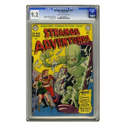 <B>Strange Adventures #10 (DC, 1951) CGC NM- 9.2 Cream to off-white pages.</B></I> By some freak of science, this isn't the highest-graded copy in CGC's census, but look closely at it and you'll see that it's a beautiful copy that will make some collector very happy. This was only the second outing for Captain Comet, who first appeared in the previous issue. The Captain's adventure was drawn by Carmine Infantino; also contributing were Murphy Anderson and Gil Kane. Overstreet 2005 NM- 9.2 value = $1,240. CGC census 11/05: 3 in 9.2, 4 higher.