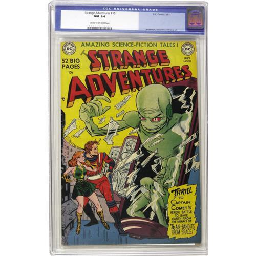 <B>Strange Adventures #10 (DC, 1951) CGC NM 9.4 Cream to off-white pages.</B></I> Captain Comet makes his second appearance in this issue. What a gorgeous copy - flat, tight, with vibrant color and a big green monster on the cover! What more could you want? Bid! Overstreet 2006 NM- 9.2 value = $1,300. CGC census 10/06: 3 in 9.4, 2 higher.<BR><BR><b>Shipping:</b> Slabbed Comic (<a target="_blank" href="http://www.heritageauctions.com/common/shipping.php">view shipping information</a>)
