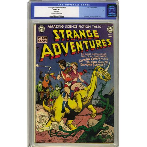 <B>Strange Adventures #12 (DC, 1951) CGC NM- 9.2 Off-white to white pages.</B></I> Gil Kane drew this issue's colorful cover featuring Captain Comet. Other artists include Murphy Anderson, Alex Toth, and Carmine Infantino. CGC notes, "Slight mis-cut." Despite this minor bindery flaw, this is an attractive copy, and is currently tied with one other as highest CGC-graded. Overstreet 2006 NM- 9.2 value = $840. CGC census 3/06: 2 in 9.2, none higher.