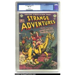 Strange Adventures #12 (DC, 1951) CGC NM- 9.2 White pages. DC's first science-fiction title was already in high-gear when this early issue came out. Gil Kane drew the otherworldly Captain Comet cover, and Murphy Anderson, Alex Toth, and Carmine Infantino contributed interior art. This colorful copy has tremendous eye-appeal, as you would expect from the highest-graded copy CGC has certified to date. Overstreet 2003 NM 9.4 value = $700. Important notice: Heritage usually auctions material at the rate of 200-250 lots per hour. On some occasions eBay Live bid software or the Internet may not be able to keep up with the pace of the auction. We recommend placing a realistic absentee bid now as insurance to avoid disappointment. Occasionally the auctioneer may eliminate or reject an eBay Live bid, and the auctioneer may also reopen a lot after the close of the eBay live bidding (usually because we missed an audience bid), and may reject your bid even if it shows you as the winning bidder. By bidding via eBay Live, you agree that Heritage may award the lot to another bidder at its sole discretion under the circumstances described above or any other reasonable circumstances. Also please note that all Heritage lots purchased through eBay Live carry a 20% Buyer's Premium. Please make sure you read the Terms and Conditions before you bid.