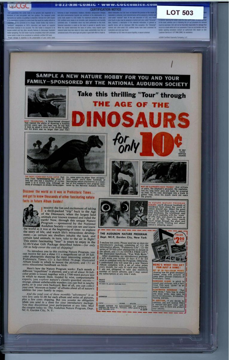 The Auctioneer has reserved the right to reject any and all bids, and to bid at the auction. Auctioneers Auctions are not on approval. Auctioneer does not allow certified material to be returned because of possible differences of opinion with respect to the grade offered by any third party organization, dealer, or service. Absolutely no guarantee of grade is offered for un-certified property sold and subsequently submitted to a third-party grading service. There will be no exceptions to this policy. Under extremely limited circumstances, (e.g. gross cataloging error) a purchaser, who did not bid from the floor, may request Auctioneer to evaluate voiding a sale; such request must be made in writing detailing the alleged gross error, and submission of the lot to the Auctioneer must be pre-approved by the Auctioneer. Bidder must notify Auctioneer in writing of such request within three (3) days of the non-floor bidder receipt of the lot. Any lot that is to be evaluated must be in our offices within 30 days after Auction. Grading does not qualify for this evaluation process nor do such complaints constitute a basis to challenge the authenticity of a lot. AFTER THAT 30-DAY PERIOD, NO LOTS MAY BE RETURNED FOR REASONS OTHER THAN AUTHENTICITY. Lots returned must be housed intact in the original holder. No lots purchased by floor Bidders may be returned (including those Bidders acting as agents for others). Late remittance for purchases may be considered just cause to revoke all return privileges. B: Auctions conducted solely on the Internet have a THREE (3) DAY RETURN POLICY: Lots paid for within seven days of the Auction closing are sold with a three (3) day return privilege. You may return lots under the following conditions: Within three days of receipt of the lot, you must first notify Auctioneer by contacting Client Service by phone (314-680-8599) or e-mail (moundcityauctions@gmail.com), and immediately mail the lot(s) fully insured to the attention of Returns, Mound City Auctions 1081 Teson Rd. Hazelwood, MO. 63042. Lots must be housed intact in their original holder and in their original condition. You are responsible for the insured, safe delivery of any lots. Auctioneer will not be responsible for lots returned in non-registered mail or lots returned without prior authorization per section B. A non-negotiable return fee of 5% of the purchase price ($10 per lot minimum) will be deducted from the refund for each returned lot or billed directly. Postage and handling fees are not refunded. After the three-day period (from receipt), no items may be returned for any reason. Late remittance for purchases revokes all Return-Restock privileges. C: Bidders who have inspected the lots prior to the auction will not be granted any return privileges. D: Comic books sold referencing a third-party grading service are sold “as is” without any express or implied warranty. Certain warranties may be available from the grading services and the Bidder is referred to them for further details: Certified Guaranty Company, LLC. (CGC), P.O. Box 4738, Sarasota, FL 34230. E: Bidders who intend to challenge authenticity or provenance of a lot must notify Auctioneer in writing within thirty (30) days of the Auctions conclusion. In the event Auctioneer cannot deliver the lot or subsequently it is established that the lot lacks title, provenance, authenticity, or other transfer or condition issue is claimed, Auctioneer's liability shall be limited to rescission of sale and refund of purchase price; in no case shall Auctioneer's maximum liability exceed the high bid on that lot, which bid shall be deemed for all purposes the value of the lot. After one year has elapsed, Auctioneer's maximum liability shall be limited to any commissions and fees Auctioneer earned on that lot. F: All comics are guaranteed genuine, but are not guaranteed as to grade, since grading is a matter of opinion, an art and not a science, and therefore the opinion rendered by the Auctioneer or any third party grading service may not agree with the opinion of others (including trained experts), and the same expert may not grade the same item with the same grade at two different times. G: Since we cannot examine encapsulated comics, they are sold “as is”without our grading opinion, and may not be returned for any reason. Auctioneer shall not be liable for any patent or latent defect or controversy pertaining to or arising from any encapsulated collectible. In any such instance, purchaser's remedy, if any, shall be solely against the service certifying the collectible. H: Due to changing grading standards over time, differing interpretations, and to possible mishandling of items by subsequent owners, Auctioneer reserves the right to grade items differently than shown on certificates from any grading service that accompany the items. Auctioneer also reserves the right to grade items differently than the grades shown in the prior catalog should such items be reconsigned to any future auction. I: Although consensus grading is employed by most grading services, it should be noted as aforesaid that grading is not an exact science. In fact, it is entirely possible that if a lot is broken out of a plastic holder and resubmitted to another grading service or even to the same service, the lot could come back with a different grade assigned. J: Certification does not guarantee protection against the normal risks associated with potentially volatile markets. The degree of liquidity for certified collectibles will vary according to general market conditions and the particular lot involved. For some lots there may be no active market at all at certain points in time."