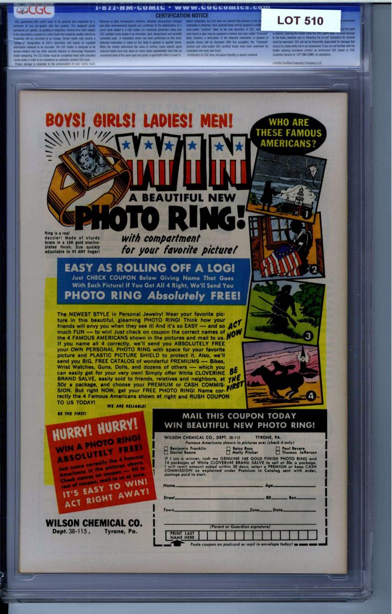 The Auctioneer has reserved the right to reject any and all bids, and to bid at the auction. Auctioneers Auctions are not on approval. Auctioneer does not allow certified material to be returned because of possible differences of opinion with respect to the grade offered by any third party organization, dealer, or service. Absolutely no guarantee of grade is offered for un-certified property sold and subsequently submitted to a third-party grading service. There will be no exceptions to this policy. Under extremely limited circumstances, (e.g. gross cataloging error) a purchaser, who did not bid from the floor, may request Auctioneer to evaluate voiding a sale; such request must be made in writing detailing the alleged gross error, and submission of the lot to the Auctioneer must be pre-approved by the Auctioneer. Bidder must notify Auctioneer in writing of such request within three (3) days of the non-floor bidder receipt of the lot. Any lot that is to be evaluated must be in our offices within 30 days after Auction. Grading does not qualify for this evaluation process nor do such complaints constitute a basis to challenge the authenticity of a lot. AFTER THAT 30-DAY PERIOD, NO LOTS MAY BE RETURNED FOR REASONS OTHER THAN AUTHENTICITY. Lots returned must be housed intact in the original holder. No lots purchased by floor Bidders may be returned (including those Bidders acting as agents for others). Late remittance for purchases may be considered just cause to revoke all return privileges. B: Auctions conducted solely on the Internet have a THREE (3) DAY RETURN POLICY: Lots paid for within seven days of the Auction closing are sold with a three (3) day return privilege. You may return lots under the following conditions: Within three days of receipt of the lot, you must first notify Auctioneer by contacting Client Service by phone (314-680-8599) or e-mail (moundcityauctions@gmail.com), and immediately mail the lot(s) fully insured to the attention of Returns, Mound City Auctions 1081 Teson Rd. Hazelwood, MO. 63042. Lots must be housed intact in their original holder and in their original condition. You are responsible for the insured, safe delivery of any lots. Auctioneer will not be responsible for lots returned in non-registered mail or lots returned without prior authorization per section B. A non-negotiable return fee of 5% of the purchase price ($10 per lot minimum) will be deducted from the refund for each returned lot or billed directly. Postage and handling fees are not refunded. After the three-day period (from receipt), no items may be returned for any reason. Late remittance for purchases revokes all Return-Restock privileges. C: Bidders who have inspected the lots prior to the auction will not be granted any return privileges. D: Comic books sold referencing a third-party grading service are sold “as is” without any express or implied warranty. Certain warranties may be available from the grading services and the Bidder is referred to them for further details: Certified Guaranty Company, LLC. (CGC), P.O. Box 4738, Sarasota, FL 34230. E: Bidders who intend to challenge authenticity or provenance of a lot must notify Auctioneer in writing within thirty (30) days of the Auctions conclusion. In the event Auctioneer cannot deliver the lot or subsequently it is established that the lot lacks title, provenance, authenticity, or other transfer or condition issue is claimed, Auctioneer's liability shall be limited to rescission of sale and refund of purchase price; in no case shall Auctioneer's maximum liability exceed the high bid on that lot, which bid shall be deemed for all purposes the value of the lot. After one year has elapsed, Auctioneer's maximum liability shall be limited to any commissions and fees Auctioneer earned on that lot. F: All comics are guaranteed genuine, but are not guaranteed as to grade, since grading is a matter of opinion, an art and not a science, and therefore the opinion rendered by the Auctioneer or any third party grading service may not agree with the opinion of others (including trained experts), and the same expert may not grade the same item with the same grade at two different times. G: Since we cannot examine encapsulated comics, they are sold “as is”without our grading opinion, and may not be returned for any reason. Auctioneer shall not be liable for any patent or latent defect or controversy pertaining to or arising from any encapsulated collectible. In any such instance, purchaser's remedy, if any, shall be solely against the service certifying the collectible. H: Due to changing grading standards over time, differing interpretations, and to possible mishandling of items by subsequent owners, Auctioneer reserves the right to grade items differently than shown on certificates from any grading service that accompany the items. Auctioneer also reserves the right to grade items differently than the grades shown in the prior catalog should such items be reconsigned to any future auction. I: Although consensus grading is employed by most grading services, it should be noted as aforesaid that grading is not an exact science. In fact, it is entirely possible that if a lot is broken out of a plastic holder and resubmitted to another grading service or even to the same service, the lot could come back with a different grade assigned. J: Certification does not guarantee protection against the normal risks associated with potentially volatile markets. The degree of liquidity for certified collectibles will vary according to general market conditions and the particular lot involved. For some lots there may be no active market at all at certain points in time."