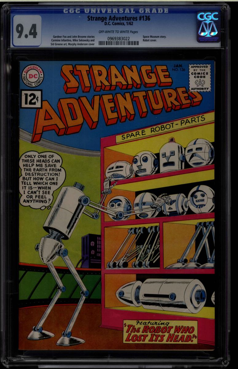 Strange Adventures #136 CGC 9.4 off-white to white pages. Gardner Fox and John Broome stories. Carmine Infantino, Mike Sekowsky and Sid Greene art, Murphy Anderson cover. Space Museum story. Robot cover.