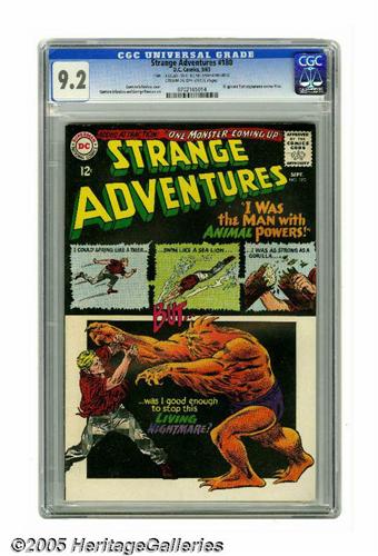 <B>Strange Adventures #180 (DC, 1965) CGC NM- 9.2 Cream to off-white pages.</B></I> After being hit with radiation, Buddy Baker found he could absorb the abilities of animals, and he became Animal Man! That origin story is told in this issue, which is the character's first appearance. The cover and interior art are by Carmine Infantino. Overstreet 2005 NM- 9.2 value = $275. CGC census 6/05: 1 in 9.2, 1 higher. <I>From the collection of Joe and Nadia Mannarino.</B></I>