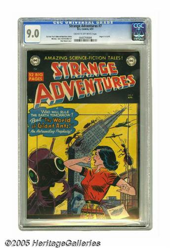 <B>Strange Adventures #7 (DC, 1951) CGC VF/NM 9.0 Cream to off-white pages.</B></I> Bob Oksner's creepy cover predicts "Who will rule the Earth tomorrow" -- how about giant purple ants? Them!! The reds, blues, and yellows practically glow against the black frame on this eye-catching cover. Inside, there's more great art by Jim Mooney, Gil Kane, and Carmine Infantino, plus the origin story of Kris KL-99. Overstreet 2005 VF/NM 9.0 value = $897; NM- 9.2 value = $1,240. CGC census 7/05: 3 in 9.0, 0 higher.