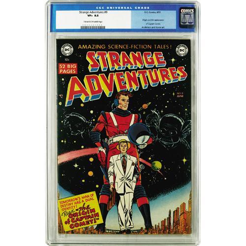<B>Strange Adventures #9 (DC, 1951) CGC VF+ 8.5 Cream to off-white pages.</B></I> Captain Comet, DC's first big hero of the post-war sci-fi era was introduced with a bang, complete with an origin story and a terrific Carmine Infantino cover. Other artists include Alex Toth, Murphy Anderson, and Bob Oksner. This copy is very attractive and fresh-looking, with very little wear noticeable on the black-background cover. Overstreet 2006 VF 8.0 value = $1,275; VF/NM 9.0 value = $2,138. CGC census 3/06: 5 in 8.5, 5 higher.
