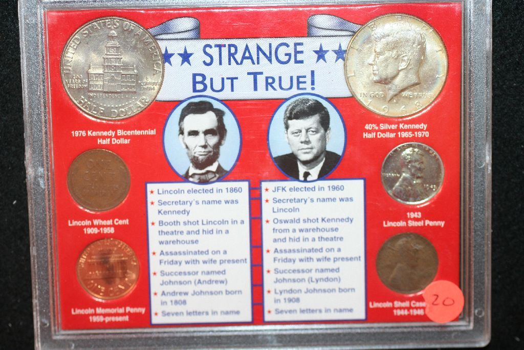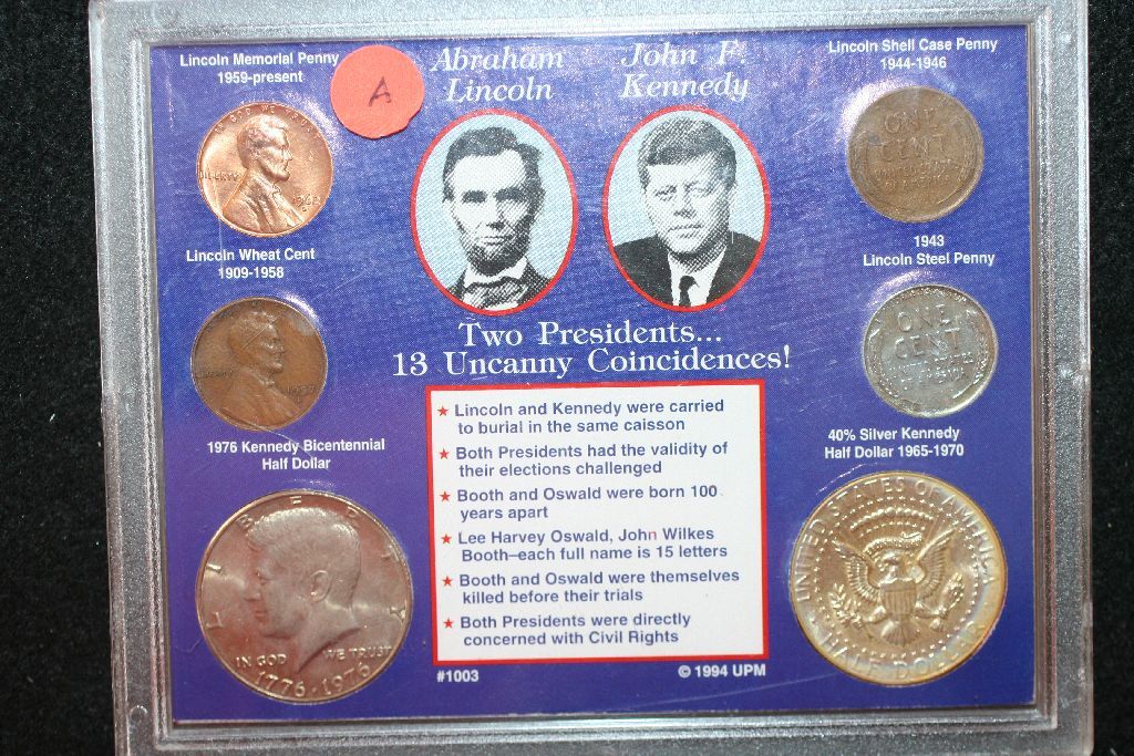 Strange But True! President Lincoln vs. President Kennedy Coin Set to Include Kennedy Half Dollar (2), Wheat Back Penny, Lincoln Memorial Penny, Wheat Back Steel Penny & Lincoln Shell Case Penny