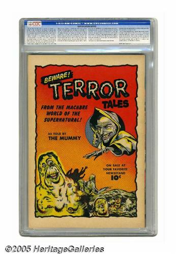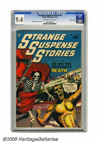 <B>Strange Suspense Stories #4 Crowley Copy pedigree (Fawcett, 1952) CGC NM 9.4 Off-white to white pages.</B></I> Here's a pre-Code horror book you may not have seen before -- we certainly hadn't! It's got cover and interior art by an expert at all things horrific, EC artist George Evans. Overstreet 2005 NM- 9.2 value = $480. CGC census 6/05: 2 in 9.4, none higher.