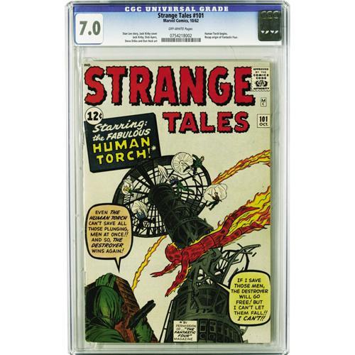 <B>Strange Tales #101 (Marvel, 1962) CGC FN/VF 7.0 Off-white pages.</B></I> This is the first superhero issue of the erstwhile horror mag, and it stars the Human Torch "by special permission of the 'Fantastic Four' magazine" -- it must have been tough for Stan Lee to get permission from... Stan Lee! He also gave himself permission to use the FF's artist <I>extraordinaire</B></I>, Jack Kirby. Meanwhile, the backup features continued in the vein of the previous 100 issues with two weird stories drawn by Steve Ditko and Don Heck, respectively. The cover is by Kirby. Overstreet 2006 FN 6.0 value = $300; VF 8.0 value = $850. CGC census 3/06: 11 in 7.0, 36 higher.