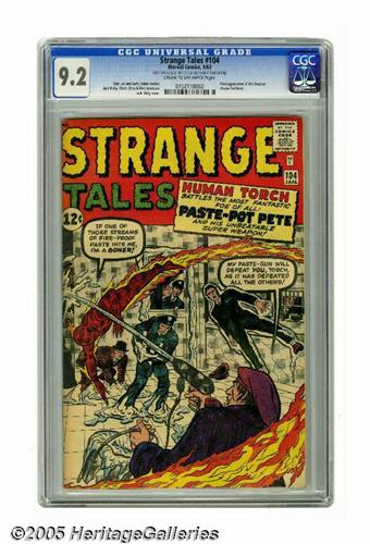 <B>Strange Tales #104 (Marvel, 1963) CGC NM- 9.2 Cream to off-white pages.</B></I> Cult villain Paste-Pot Pete made his first appearance in this issue! If you're one of those Pete fans who can't get enough of the baddie with the Paste-Gun, and you join us in decrying the unbelievably horrible decision to rename him "the Trapster" and lame-ify his costume, you'll want to get Pete's first appearance. And guess what, this is the nicest copy of the issue we've ever offered! The cover and art are by Jack Kirby. There are also two more stories, with art by Steve Ditko and Larry Lieber. Overstreet 2005 NM- 9.2 value = $460. CGC census 6/05: 5 in 9.2, 2 higher. <I>From the collection of Joe and Nadia Mannarino.</B></I>