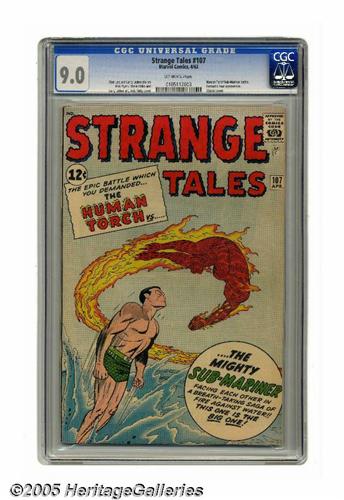 <B>Strange Tales #107 (Marvel, 1963) CGC VF/NM 9.0 Off-white pages.</B></I> The Human Torch battles the Sub-Mariner. Sub-Mariner's fourth Silver Age appearance. Jack Kirby cover. Dick Ayers art. Two backup features with art by Steve Ditko and Larry Lieber. Overstreet 2005 VF/NM 9.0 value = $297; NM- 9.2 value = $400. CGC census 3/05: 10 in 9.0, 10 higher.