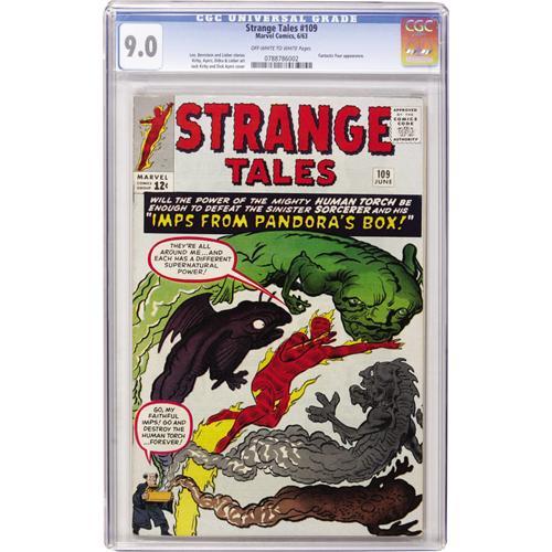<B>Strange Tales #109 (Marvel, 1963) CGC VF/NM 9.0 Off-white to white pages.</B></I> Jack Kirby cover. Human Torch story with Kirby art, guest-starring the rest of the Fantastic Four. Backup features with Steve Ditko and Larry Lieber art. Overstreet 2006 VF/NM 9.0 value = $249; NM- 9.2 value = $340. CGC census 3/07: 10 in 9.0, 11 higher.<BR><BR><b>Shipping:</b> Comics - Slabbed (certified) (<a target="_blank" href="http://www.heritageauctions.com/common/shipping.php">view shipping information</a>)