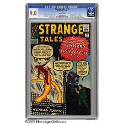 <B>Strange Tales #110 (Marvel, 1963) CGC VF/NM 9.0 Off-white pages.</B></I> He's not on the cover, but Doctor Strange made his first appearance in this issue's backup feature. Also in that story (drawn by Steve Ditko) is the first appearance of the Ancient One. Jack Kirby's cover is devoted to the Human Torch story (featuring the Wizard as well as cult villain Paste-Pot Pete). Dick Ayers handled interior art on the Torch. It's a sharp-looking copy of a key first appearance. Overstreet 2004 VF/NM 9.0 value = $1,393; NM- 9.2 value = $1,875. CGC census 1/05: 12 in 9.0, 14 higher.