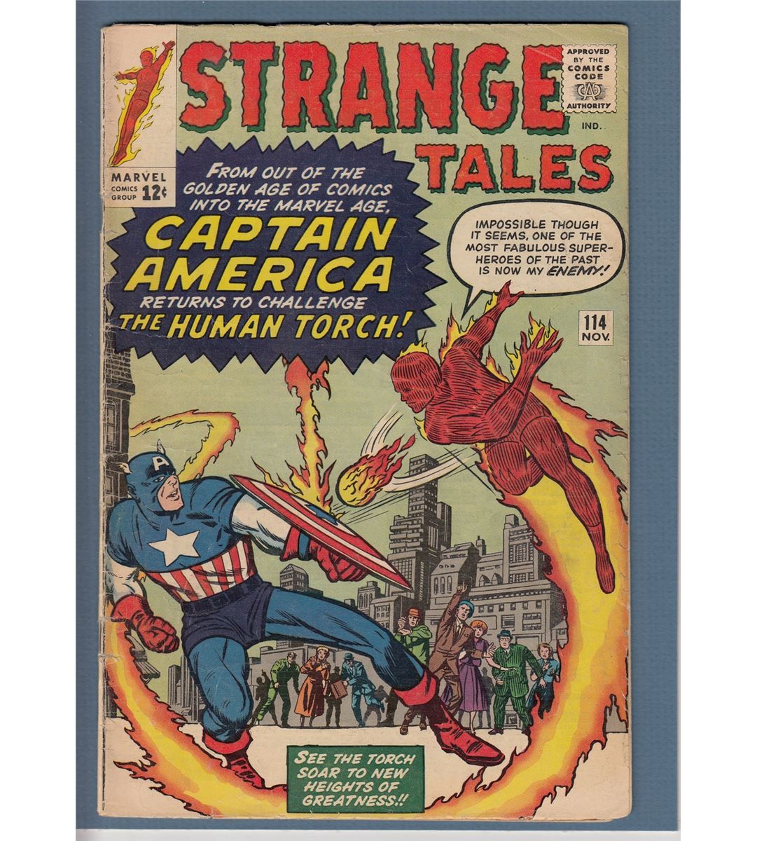 Strange Tales #114(1963) Acrobat disguised as Capt. America, 1st Silver age app.,1st app. Victoria Bentley, 3rd Dr. Strange app. Stan Lee(writer) Jack Kirby(art) Mid Grade