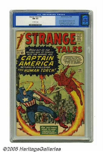 <B>Strange Tales #114 (Marvel, 1963) CGC NM 9.4 Off-white pages.</B></I> The Human Torch meets an impostor posing as Captain America, in what amounted to a tryout for the real Cap (Marvel admitted as much). Sure enough, the real character returned in the pages of <B>The Avengers</B></I> just a few months later. The issue also features the third appearance of Doctor Strange. Jack Kirby drew the cover and the Human Torch story, while Steve Ditko drew the Doctor Strange tale. Overstreet 2005 NM- 9.2 value = $625. CGC census 6/05: 7 in 9.4, 3 higher.