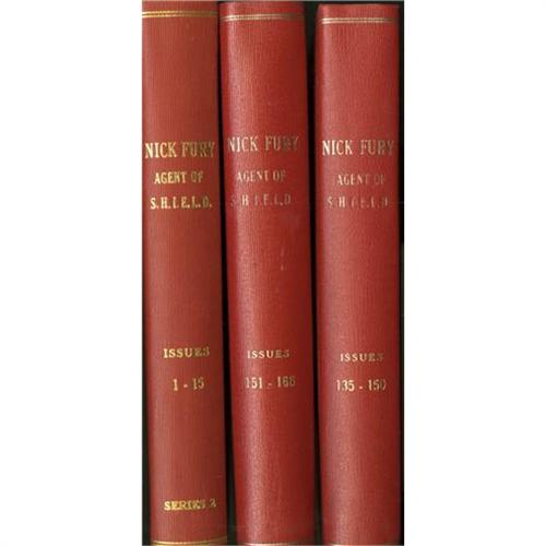 <B>Strange Tales #135-166 and Nick Fury Agent of S.H.I.E.L.D. #1-15 Bound Volumes (Marvel, 1965-69).</B></I> These comics take you from the first appearance of S.H.I.E.L.D. through a near-complete run of Fury's <B>Strange Tales</B></I> appearances and on to all of the great Jim Steranko stories in Fury's own book (the <B>Strange Tales</B></I> run is missing only the last two S.H.I.E.L.D. stories in #167-168; and the only <B>Nick Fury</B></I> issues not included here were reprint issues, not new stories). These are trimmed copies which have been bound into three red hardcover volumes. The pages show tanning, but the cover gloss of the comics is excellent. Note that the embossed spines are mislabeled, not mentioning <B>Strange Tales</B></I>. Issue #150, while present, is bound out of order. Overstreet VG 4.0 value for group = $530.